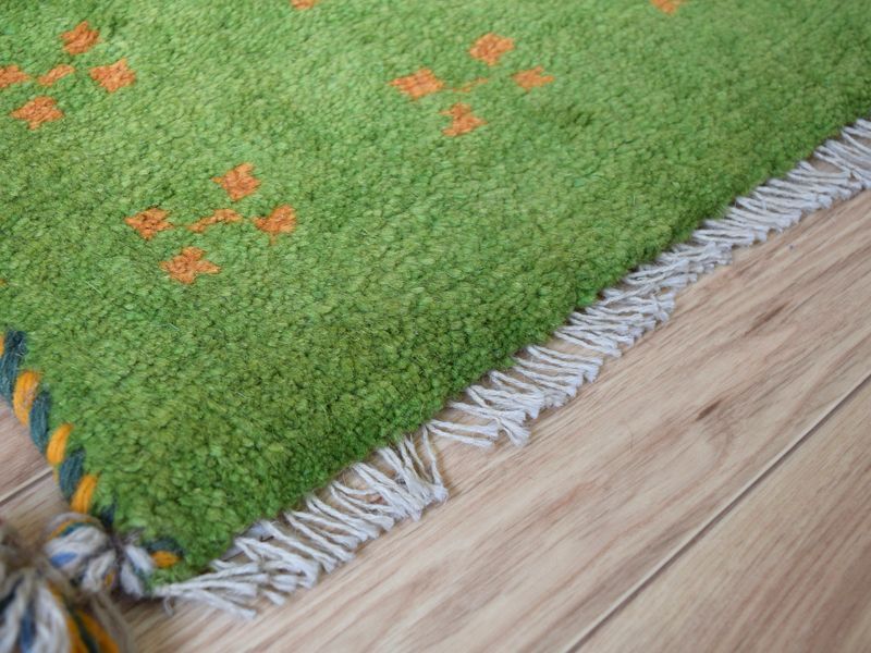 イラン・シラーズで作られたハンドメイドギャッベです。 植物、草木や実などを主にした自然由来の素材で染色するギャッベはまさに自然界からの贈り物です。 あたたかみを感じるハンドメイドの風合いは、敷いてあるだけでお部屋とこころに彩りを与えます。 自然由来の染料で肌に優しく、長い毛足がふかふかとしてコシのあるソフトな手触りです。 味わい深いのハンドメイドのペルシャギャッベです。 ----- 【見た目に、、、】 ギャベならではのふかふかとしたコシのある柔らかな羊毛毛足(ウールパイル)が立ち上がり良く並び、見た目にもみっしりと詰まった毛足の肉感を感じます。 ミニギャッベのフィールドには、抽象化された花のシンボルが要所にちりばめられたシンプルなデザインです。 近めに見るとマットな質感を感じる毛足です。 優しい色合いとカラフルなシンボルたちに彩られた毛足は、光の当たり具合によって鮮やかな色合いをより美しくその表情を変えてくれます。 ----- 【触り心地は、、、】 みっしりと肉感を感じるしっかりした織り地のベースで、上に物を置いても安定する織り地です。 絨毯全体の毛足は、ふわりとした羊毛の1本1本がみっしりと密集して立ち上がっています。 1本1本がふわふわとした毛足で、面で触るとウールパイルに深く沈み込み、ふかふかとした肉感と毛足のもちもちとした低反発感ある弾力としっかりとしたコシのある触り心地で、やわらかく長い毛足に包みこまれる様です。 絨毯を足で踏みしめたり腰かけた際には、もっちりとした弾力あるパイルに沈む感触を味わうことのできる1枚です。 やや毛流れに傾き揃った毛足を毛流れ方向に沿って撫でるとふわふわとしたウールの柔らかな手触り。 やや毛羽立つ様な、均一な長さで揃えられた長い毛足は、1.5cm程度と肉厚な立ち上がりで、やや毛羽立つ様な味のある不揃い感があり素朴な印象です。 持ち上げるとみっしりと詰まった分厚い毛足の重厚な肉感を感じる織り地です。 ----- 【状態詳細は、、、】 見た目はふかふかですが、寒暖の差が激しいイラン南部に暮らす遊牧民が昔から織って使ってきた敷物ですので、夏でも快適に過ごせます。 1.5cm程の厚みのわりに通気性があり、ホットカーペットの上に敷いても、ほんわかと心地よい暖かさが伝わってきます。 フリンジ房はウールで結ばれています。 新品未使用のギャッベで、あなたの暮らしの営みと共に時間を歩む事の出来る、これから長くご使用いただけるお品です。 ふかふかした毛足(パイル)で、手触りが気持ちいい手織りのギャッベ。 天然由来の染料で染められたウールの色あいと素朴であたたかみのある手織りのじゅうたんで、 暮らしを明るく彩ります。 手織りならではの一枚一枚違ったテイストをお楽しみください。 ----- 【サイズ感は、、、】 ふかふかした毛足で、手触りが気持ちいい約60×40cm程度のサイズ感の手織りのギャッベ。 マンションなどの玄関マットとして、またベンチスツールの座布団、椅子の足元などに使えるサイズです。 仕事机や勉強机の下の開いたスペースに置くと、足元があたたかくすごせます。 プレゼントにも是非どうぞ。 ミニマットサイズは、玄関マットやベンチスツールの座布団、椅子や姿見の足元や、勝手口等マルチに活躍します。 お仕事机や勉強机の下に敷いて、足元に包まれる様なウールの安心感を与えてくれます。 取り回し易いサイズ感は気分によって敷き替えをしたり、暮らしの中で様々な表情を見せてくれます。 良いラグはあなたの空間を特別なものに変えてくれます。 ----- ***デザインやカラーリングについて*** ◆全体のデザイン◆ ギャッベならではの素朴なデザインで、遊牧民のシンボルモチーフがフィールド一杯に散らばめられる様にデザインされています。 シンプルなデザインはインテリアの雰囲気をより良いものにしてくれます。