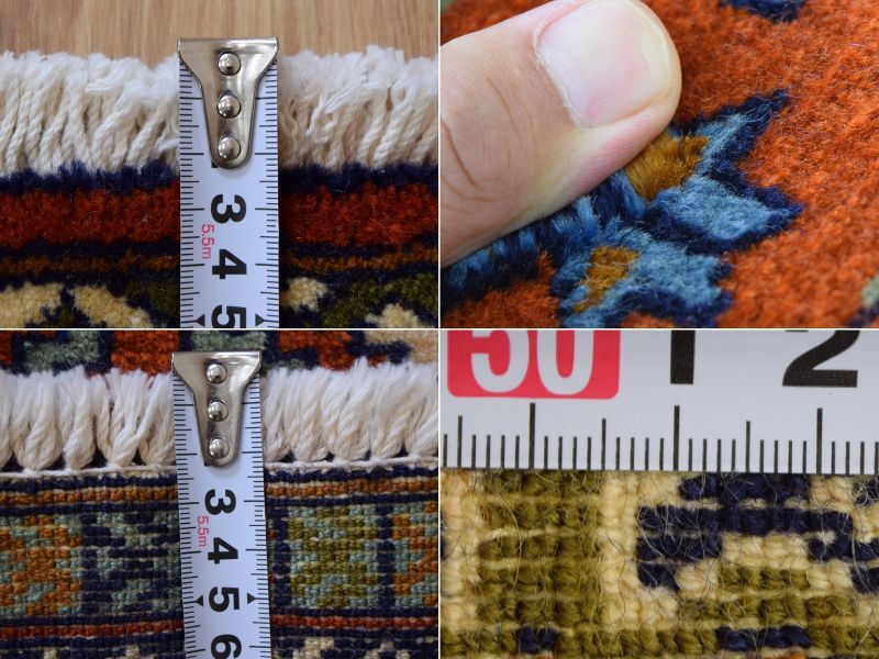 -------- 【見た目に、、、】 まろやかな色合いの美しい絨毯です。 みっしりと詰まって立ち上がる状態の良い毛足が表地に並び見た目にも肉感があります。 全体にカラフルな色合いが使用されはっきりとしたクリアな色合いですが、ウールに染色された色合いのまろやかさも合わさって優しい印象を与えます。 薄手ながらも肉厚感のある見た目です。 キメ細かくみっしりと詰まったきめ細かな毛足が見た目に繊細なデザインを引き立てています。 1本1本がふわふわとした柔らかな毛足はきめ細かで、密に並んで立ち上がり良い毛足は上に観葉植物のプランター等を置いても非常に安定するしっかりとした織り地です。 近めにはマットな見た目、遠目にツヤ感の感じる毛足で、角度によってクリーミーな色合いから光が反射して輝くような色合いへと印象を変えます。 -------- 【触り心地は、、、】 薄手ですが、面で触るとキメ細かく柔らかな毛足のもちもちとした低反発感ある弾力を感じる織り地です。 毛足に沿って撫でるとさらりとした感触です。 柔らかな触り心地はウールに包み込まれるようでとても安心感を与えてくれます。 ウールパイルの1本1本がふわふわとしたきめ細かな毛足で立ち上がりの良い毛足の状態です。 持ち上げるとくにゃりとする柔らかな毛足です。 キメ細かくみっしりと詰まった肉感を感じ、ふわふわとした毛足の肉感を感じます。 柔らかな肉感と共に床面の感触が身体に伝わり、包み込まれるような安心感ある優しい感触を味わえます。 -------- 【状態詳細は、、、】 柔らかなウールを使用しておられた手織り絨毯で、イラン本国にてクリーニング済の美品状態です。 柔らかく良質なウールを使用して緻密な模様を織りあげられています。 密に詰まった均一な毛足の立ち上がりもよく、深く落ち着いた色合いから白く反射する様に変化するフィールドの色合いの美しさが際立ちます。 絨毯全体の毛足は、1本1本のやわらかな毛足がみっしりと密集して、きめ細かです。 約1.0cm程度の薄手な毛足ですが見た目にも柔らかな肉感を感じる均一な立ち上がりの毛足です。 柔らかな美品状態の毛足で、スレ等ダメージはなく、美しい色合いやふわふわとした柔らかなウールの良質さが際立ち、絨毯全体の印象を優しいものにしています。 本場イランでのクリーニングを経て気持ちよくお使いいただけます。 --------