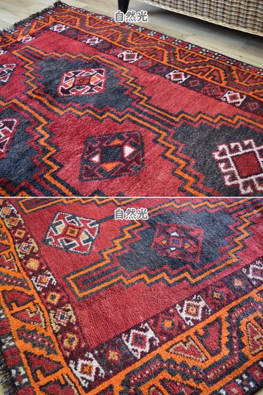 ***デザインやカラーリングについて*** ◆全体のデザイン◆ 絨毯の中央に3連のメダリオンが並ぶデザインです。 メダリオンはトランジと呼ばれ、宇宙の中心を指しているとも言われています。 中央やその付近に配されたギザギザとした鈎型の縁取りのトランジはドラゴンやサソリを基にされたデザインと言われ、厄除けの意味合いがあります。 直線的に描かれたジオメトリックなデザインの絨毯です。 中央のメダリオンの他、フィールドには絨毯の上下に幹が伸びて生命力を感じさせる花の模様が配されています。 ----- ◆全体のカラーリング◆ フィールド全体に使用された赤や縁取りに使用されたオレンジの暖色系の色合いがベースカラーになっています。 経年の色合いの変化やふわりとやわらかな毛足の風合いも合わさって、他の絨毯にはない味わい深い1点物の色合いです。 メダリオンやボーダーはムラ感ある色落ちをした赤や黒、オレンジ色が使用されてい味わい深い印象を与えます。 経年により全体的にまろやかな印象となった毛足は、全体にクリーミーな色合いの印象です。 遠目に見るとツヤ感を感じ、反射するような白い色合いからまろやかな色合いへと表情を変化させてくれます。 全体に近めにマットな、遠目にツヤ感のある印象を与える毛足のツヤ感です。