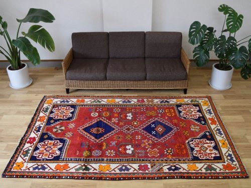 | 原産国 | イラン・シラーズ *** シラーズは、イラン南西部ファース州(ファールス州)の州都として、古代ペルセポリス等を有する街です。 シラーズの北部にはザグロス山脈がはしり、比較的温和な気候です。 その気候を活かして穀物や綿花や花々等が栽培されています。 約人口120万人のこの都市は、石油化学コンビナート等の工場を有する工業都市でもあります。 名門のシラーズ大学を有する教育盛んな都市としても知られています。 街には庭園やペルシャの詩人のサーディの墓(サアディー廟/サアディーヤ)、古代ペルセポリス等遺跡があり、沢山の歴史的な場所もあるシラーズはイスファハーンに次ぐ観光都市としても知られています。 ----- シラーズのバザールには、シラーズ市周囲の遊牧民・住民にて織られた手織り絨毯の集積場として、多くの部族による絨毯が集められ取引される、大規模なバザールとなっています。 シラーズの周辺地域には、カシュカイ族をはじめ、ハムセやルリ等の部族が暮らしています。 元々遊牧民として生活していたこれらの部族は現在は定住しているものが殆どで、部族に古くから伝わる伝統的方法で絨毯を織っています。 ---- 主にシラーズ周辺部族の絨毯は、一般的にパイル糸、縦・横糸にウールを使用して織られるものが多く、ものによっては、横糸にコットン糸やゴートウール(ヤギの毛糸)を、縦糸にゴートウールを使用するものもあります。 |