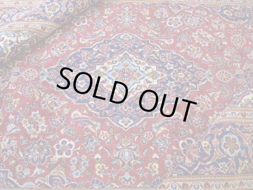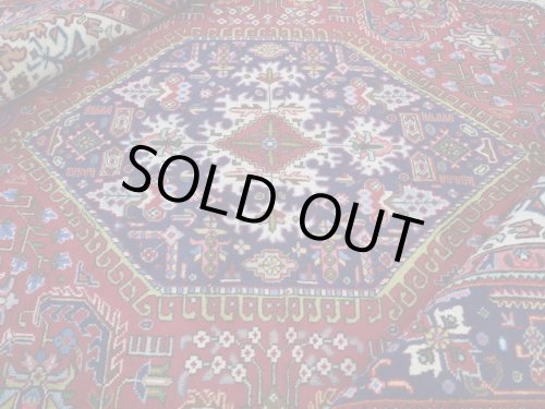 -------- 【サイズ感は、、、】 約6.2㎡・〜6帖程度のサイズ感で、大判の絨毯はリビング・ダイニングルームや客室の中心に、3人掛けソファやコーナーソファの足元に敷いてお部屋をくつろぎの空間に変えてくれます。。。 ホテルや旅館、ペンション等の人の集まる場所にも最適な大きなサイズと上品な美しさです。 大きなサイズはホテルや旅館、ペンション等のお客様をおもてなしする場にも相応しい大きなサイズと良質な毛足、上品な美しさを兼ね備えた1枚です。 良いラグはあなたの空間を特別なものに変えてくれます。 -------- ***デザインやカラーリングについて*** ◆全体のデザイン◆ こちらの絨毯は中央にメダリオンを配した『トランジ』デザインです。 中央にメダリオンをフィールドの四隅にコーナーメダリオンを配していることから『メダリオンコーナー』デザインとも呼ばれます。 フィールドの余白を小花で埋め尽くしたゴルミナデザインです。 バクティヤリで古く織られるメダリオンや花模様のデザインで、ダイナミックで力強い印象のデザインです。 落ち着いた配色、デザインのバランスが落ち着きを与えてくれる王道のデザインと言えます。 見ていて飽きの来ない、見ていると様々な発見のある素敵な絨毯です。 古くから使用される王道デザインは落ち着きと安心感を与えます。 ◆全体のカラーリング◆ 全体に赤とネイビーの色合いがベースになっています。 全体的に経年による色合いの変化のため、まろやかな色合いで、ややくすんだ印象を与える深く落ち着いた色合いです。 経年による色ムラ感のある色合いの毛足に関しても、良好な状態の毛足です。カスレて毛足がなくなっている様な事はありません。 中央のトランジメダリオンや四隅のコーナートランジメダリオンにはネイビーが使用され、フィールドやボーダーには赤の色合いが使用されベースカラーとなっています。 絨毯全体に配された花々や草木やメダリオン等の細かな装飾には赤系や青系の濃淡、茶等の色合い等の色合いが使用され、全体的にカラフルですが、統一された色合いを使用し絨毯に落ち着きを与えています。 キメ細かく柔らかなウールにまろやかな色合いが染色され、そこに経年の色合い変化や引き締まりを見せた毛足が、やさしくクリーミーな色合いの印象を与えています。 力強い縁取りが使用され、活き活きとした花々や草木の模様を際立たせています。 ぺたりと毛流れ方向に寝た毛足の流れに日差しが当たることや、見る向きや角度によって見え方が美しく変わります。 白っぽく反射するような色合いから、深くクリーミーな落ち着きあるまろやかな色合いへと表情を変化させてくれます。 日差し、影、部屋の電気、間接照明など、朝、昼、夜で違った顔を見せてくれるところも素晴らしいところです。