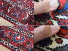 【状態は、、、】 良質なウールを使用して織りあげられた絨毯です。 ビンテージ品ですが、みっしりと詰まった豊富な毛足は均一に整えられ、クリーニングメンテナンス済の良い状態です。 経年の色合い変化が見られますが、美しい味わいとして感じられ、それにより毛足がくたびれてダメージとなっている様な印象は与えません。 キメ細かく毛足は短く均一に整っており、絨毯の色合いや模様を一層美しい印象として引き立てています。 古くから織られるバクティヤリ絨毯ならではの、しっかりと織られた簡単に捲れる事のない織り地です。持ち上げるとずっしりとした密に詰まった織り地を感じます。 簡単にはめくれにくく安定感があり、持ち上げるとがっしりとした織り地の弾力があります。 毛足やセルビッチ(大外の縁取り)の大きなダメージも見受けられず、状態の良いGOODコンディションのお品です。 全体的な状態が良いGOODコンディションのヴィンテージ品で、大きなスレ等のダメージもなく、本場イランでのクリーニングを経て気持ちよくお使いいただけます。