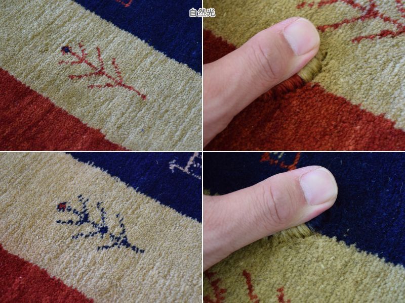 【状態詳細は、、、】 25万ノット/㎡程度の細かさで織られたリーズバフトのグレードの細かな織のギャッベです。 絨毯全体の毛足は、ふわりとした羊毛の1本1本がみっしりと密集して立ち上がっています。 みっしりと並んだ表地の毛足は、1.5cm程度と肉厚な立ち上がりで、ややムラ感のある肉感がハンドメイドの温かみを感じさせ、見た目にも毛足の詰まった肉感ある印象です。 しっかりとした織り地のベースの絨毯の裏を見ると、織り込まれた編目は均一でみっちりと密に並んで、上に物を置いても安定するがっしりとした織り地です。 優しい色合いとカラフルなシンボルに彩られた毛足は、光の当たり具合によって鮮やかな色合いをより美しくその表情を変えてくれます。 フリンジ房はウールで結ばれています。 新品未使用のギャッベで、あなたの暮らしの営みと共に時間を歩む事の出来る、これから長くご使用いただけるお品です。