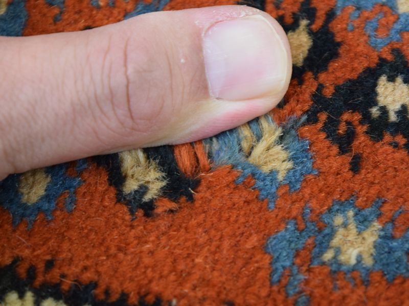 -------- 【見た目に、、、】 みっしりと詰まって立ち上がる状態の良い毛足が表地に並び見た目にも肉感があります。 全体にカラフルな色合いが使用されはっきりとしたクリアな色合いですが、ウールに染色された色合いのまろやかさも合わさって優しい印象を与えます。 1本1本がふわふわとした柔らかな毛足はきめ細かで、密に並んで立ち上がり良い毛足は上に観葉植物のプランター等を置いても非常に安定するしっかりとした織り地です。 近めにはマットな見た目、遠目にツヤ感の感じる毛足で、角度によってクリーミーな色合いから光が反射して輝くような色合いへと印象を変えます。 -------- 【触り心地は、、、】 面で触るとキメ細かく柔らかな毛足のもちもちとした肉感・低反発感ある弾力を感じる織り地です。 毛足に沿って撫でるとさらりとした感触です。 柔らかな触り心地はウールに包み込まれるようでとても安心感を与えてくれます。 ウールパイルの1本1本がふわふわとしたきめ細かな毛足で立ち上がりの良い毛足の状態です。 キメ細かくみっしりと詰まった肉感を感じ、ふわふわとした毛足の肉感を感じます。 柔らかな肉感と共に床面の感触が身体に伝わり、包み込まれるような安心感ある優しい感触を味わえます。 -------- 【状態詳細は、、、】 柔らかなウールを使用しておられた手織り絨毯で、イラン本国にてクリーニング済の美品状態です。 柔らかく良質なウールを使用して緻密な模様を織りあげられています。 密に詰まった均一な毛足の立ち上がりもよく、深く落ち着いた色合いから白く反射する様に変化するフィールドの色合いの美しさが際立ちます。 絨毯全体の毛足は、1本1本のやわらかな毛足がみっしりと密集して、きめ細かです。 約1.0cm程度の毛足ですが見た目にも柔らかな肉感を感じる均一な立ち上がりの毛足です。 柔らかな美品状態の毛足で、スレ等ダメージはなく、美しい色合いやふわふわとした柔らかなウールの良質さが際立ち、絨毯全体の印象を優しいものにしています。 本場イランでのクリーニングを経て気持ちよくお使いいただけます。 --------