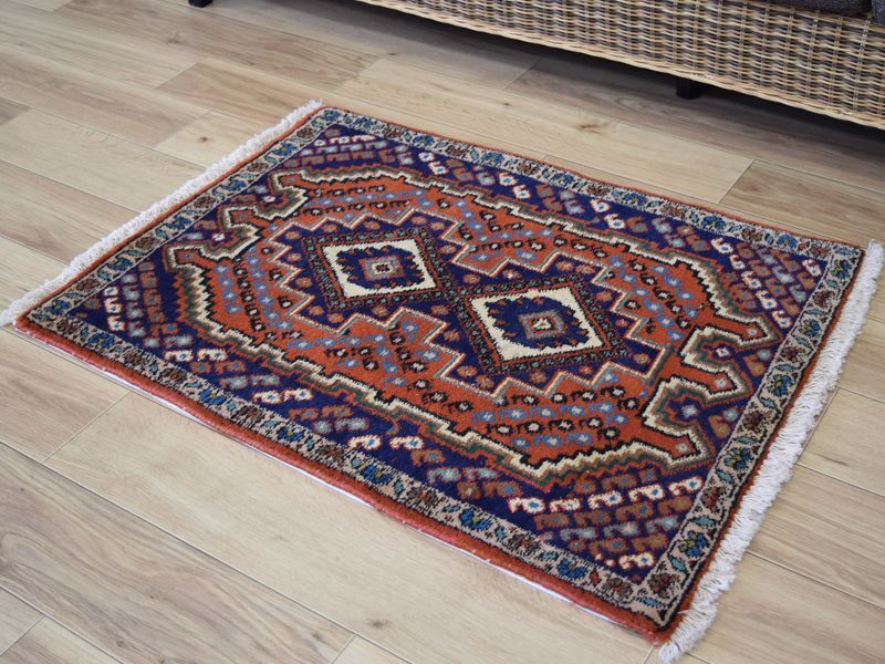 【サイズ感は、、、】 約90×60cmのサイズ感は、玄関マットとして最適なサイズです。 玄関マットやチェアマット、勝手口や姿見の足元等に幅広く使えるサイズです。 子供部屋のアクセントやファンヒーターストーブの前に敷くのもおススメです。 寝室ではベッドサイドの足元に敷くことで、1日の始まり、1日の終わりを特別な気持ちで過ごすことが出来ます。 オーディオに囲まれた音楽部屋や書斎、趣味の空間にもいいですね。 気分や季節によってポジションチェンジも気軽です。 手織りウールは冬あたたかく、夏はさらりとした質感で通年敷いていただけます。 天然ウールのやさしさをたっぷり楽しめる贅沢なサイズです。 良いラグはあなたの空間を特別なものに変えてくれます。 -------- ***デザインやカラーリングについて*** ◆全体のデザイン◆ シラーズ絨毯等にも見られるヘイバトルーと呼ばれる形のメダリオンを中心に特徴的な縁取りを見せるデザインに、アフシャル絨毯によくみられるボテ柄があしらわれています。 ボテ模様は、数字の6にも見える模様ですが、ペイズリー柄の原型の模様と言われます。