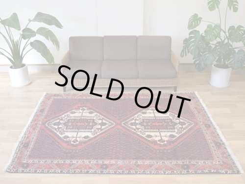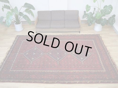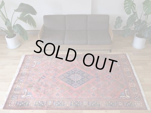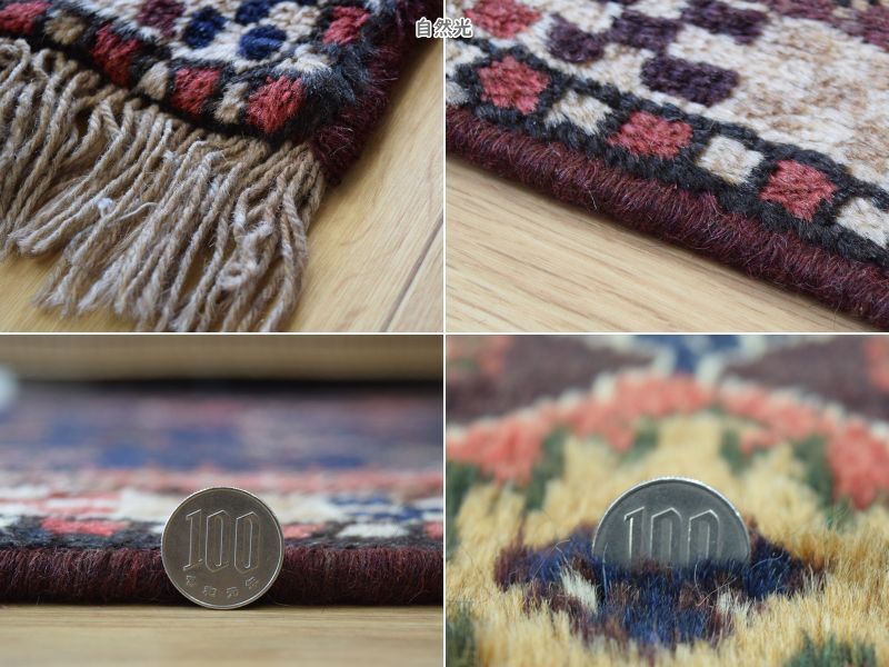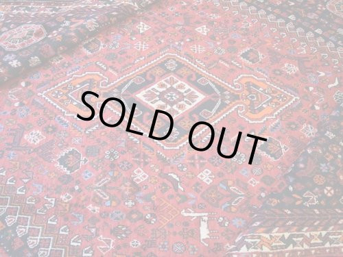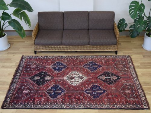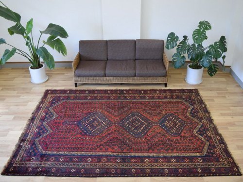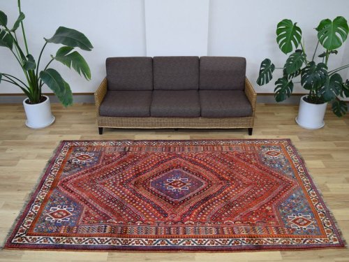 -------- 【サイズ感は、、、】 縦2m横2mの正方形スクエアサイズの約4㎡・〜4.5帖程度のサイズ感で、大判の絨毯はリビング・ダイニングルームや客室の中心に、3人掛けやコーナーソファの足元に敷いてお部屋をくつろぎの空間に変えてくれます。。。 3人掛けソファの足元では、中心にローテーブルを置いても、大人数人が横になれる余裕のあるサイズ感です。 オーディオに囲まれた音楽部屋や書斎、趣味の空間にもいいですね。 ホテルや旅館、ペンション等の人の集まる場所にも最適な大きなサイズと上品な美しさです。 大きなサイズはホテルや旅館、ペンション等のお客様をおもてなしする場にも相応しい大きなサイズと良質な毛足、上品な美しさを兼ね備えた1枚です。 良いラグはあなたの空間を特別なものに変えてくれます。 -------- ***デザインやカラーリングについて*** ◆全体のデザイン◆ シラーズ地域のカシュガイ族により織られた部族絨毯です。 こちらの絨毯は中央に大きくトランジメダリオンを配し、絨毯の四隅にラチャキトランジを配した『メダリオンコーナー』デザインです。 中央のメダリオンを中心に、フィールド一杯に生命力を感じさせる草木や花々、動物等の遊牧民のシンボルが直線的に描かれています。 描かれたシンボルにも意味合いがあり、鳥は幸せを運ぶ『神様の使者』として描かれています。それぞれ遊牧民の願いや特別な意味合いが込められています。 細かくデザインされ散りばめられた模様ははそれぞれに表情があり、規則正しく配されたデザインは絨毯を華やかに彩ります。 全体に細かな模様が配されていますが、配色の統一、デザインのバランスが落ち着きを与えてくれます。 見ていて飽きの来ない、見ていると様々な発見のある素敵な絨毯です。 ◆全体のカラーリング◆ 全体に赤、ネイビー系の色合いで描かれていて、ウールに染められた色合いは経年の影響もあり、とても落ち着きのあるややくすんだ色合いの印象です。様々な色合いを使用していますが目に痛い様な色合いではありません。 毛足が豊富でやや毛羽立つ様なことやウールのツヤ感の影響もあり、見る角度の表情変化がとても大きい印象です。ツヤツヤと反射する白っぽく輝くような印象から、深く落ち着いた色合いへと印象を変えます。 毛足に流れがあることにより、日差しや照明の明かり、見る角度による見え方の違いが楽しめます。 日中と夜の見え方の違いがとても面白く、昼間は日差しの反射で艶々と反射して見えるような見た目が、夜は間接照明などでより深く、落ち着いた佇まいを見せてくれます。 日々の暮らしの中で美しさに対する気づきをもたらしてくれます。