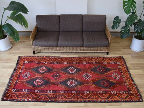 イラン・シラーズのビンテージ部族絨毯(トライバルラグ)です。 イランより新品未使用デッドストックのシラーズ産カシュガイ族の部族絨毯を仕入れいたしました。 経年によりくたっとやわらかく緩やかなウール毛足が特徴的で、未使用品の為毛足も豊富で長く美品と呼べるコンディションです。 織られた地域でデッドストック品として長期保存されていた品で、大きなダメージ等修復跡が無く豊富なパイルなものを選定し仕入れしております。 イラン現地でクリーニングメンテナンスの上日本へ輸入を行っており、中古品に抵抗がある方にも問題なくお勧めできます。 -------- 【見た目に、、、】 ふわりとやわらかな毛足が豊富に並び、見た目にも肉感を感じます。 草木染で染められた色合いは、やや淡くくすんだ印象で経年の味わい深い色合いです。 ふわりとやわらかく長い毛足がやや毛流れの方向にやや寝ていて、見た目の表情変化をより美しいものにしています。毛足のツヤ感も相まって見る角度や照明で大きく表情を変化させます。 経年のお品ですが、豊富な毛足で、見た目にも肉感があります。 近めにマットな、遠目にツヤ感を感じる毛足です。 -------- 【触り心地は、、、】 しっかりとウールの経糸で織られた織地に、やわらかく長い毛足が緩やかに並びます。 面で触ると長いウールの優しくふわりとやわらかな感触で、ウールに包まれる様な感触です。縦糸、表地毛足共にウールで織られており暖かく保温性に富んでいます。経年によりウールの質感はやや痩せた様な、よりくたっとやわらかな印象です。 毛足に沿って撫でるとサラリとしたしなやかな毛足の肉感も感じることが出来ます。 持ち上げるとくにゃりとやわらかくしなやかな織地で、歩いたり、腰を下ろした際には柔らかな弾力とウールの厚みを感じさせやわらかな毛足の感触が床面の感触と共に伝ってきます。 柔らかな触り心地は、床面の感触と共にほのかに伝わり、ウールに包み込まれるようでとても安心感を与えてくれます。 絨毯の上でヨガやストレッチをしても気持ちの良い柔らかな肉感があります。 ウールパイルの1本1本がふわふわとしたきめ細かな毛足です。 密集し、均一に立ち上がった引き締まりの良い毛足に沿ってなでるとふわふわとした柔らかな触り心地です。 暮らしの中で年月と共に深まる風合いをお楽しみください。 -------- 【状態詳細は、、、】