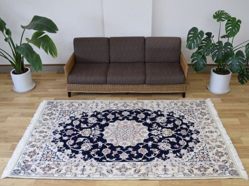 【見た目に、、、】 カシャーン産ならではのメダリオンコーナーデザインです。 ダイナミックに描かれたメダリオンを中心にアラベスク調のデザインに花々が入り乱れる華やかな王道のデザインに、全体の深みある赤を基調としたウールの色合いが非常に優しい印象で上品です。 キメ細かくみっしりと毛足が並ぶ見た目にも肉感があります。 優しい色合いは柔らかな毛足の印象とマッチしています。 近めに見るとマットな質感、遠目に見るとツヤ感を感じる毛足です。 -------- 【触り心地は、、、】 柔らかなウールで織られたみっちりと詰まった織で、しっかりとコシのある肉感ある毛足です。 手触りは、面で触ると肉感ある毛足のふかふか感と、もちもちとした低反発感ある弾力を感じる肉厚な織り地です。 柔らかな肉感と共に床面の感触が身体に伝わり、包み込まれるような安心感ある優しい感触を味わえます。 膝立ちをしても床面の感触は少ないです。とてもきめ細かな毛足が密集して並んで、コシのある弾力ととても柔らかな感触を与えます。 ゴロンと絨毯に身を預けて横になると毛足が柔らかで気持ちが良いです。 毛足に沿って撫でるとふわりとした毛足の肉感も感じることが出来ます。 1本1本がきめ細かくやわらかな毛足は非常に良質で、ふかふかとしています。 -------- 【コンディション詳細は、、、】 良質な毛足に緻密に織られた織り地は美しくクリアな状態で手触り・色合い共に美しい状態です。 大きなダメージも無く、全体的な毛足の状態が良い良品と言えるヴィンテージ品で、本場イランでのクリーニングを経て気持ちよくお使いいただけます。 20年程度の経年のお品ですが、非常に立ち上がりの良い、ふかふかとした肉厚でやわらかな毛足のお品です。 厚みは約1.5cm程度で、柔らかな毛足がみっしりと詰まっており、滑らかで美しい毛足です。 持ち上げるとみっしりと詰まった肉感ある織り地で、歩いたり腰を下ろした際には、ウールの優しい感触が伝ってきます。 柔らかな毛足は見る角度や日差しによって美しく見た目を変えてくれます。 絨毯の裏を見ると、コットンの経糸にしっかりと織り込まれた編目はみっちりと正方形で密に並んでおります。 しっかりとした均一で密な織り地で、上に物を置いても安定するベースです。 毛足やセルビッチ(大外の縁取り)の大きなダメージも見受けられず、状態の良いGOODコンディションの美品です。 フリンジや、生成り部分、ボーダーの一部ににうっすらと色移りが見受けられますが、使用上の問題はございません。 -------- 【サイズ感は、、、】 約3.8㎡・〜4帖程度のサイズ感で、リビング・ダイニングルームや客室の中心に、3人掛けやコーナーソファの足元に敷いてお部屋をくつろぎの空間に変えてくれます。。。 2〜3人掛けのソファーの前に敷いて、ローテーブルを置くことの出来るサイズです。 ダイニングルームや寝室、書斎や趣味の部屋にもアクセントとして活躍します。 寝室ではベッドサイドに敷くことで、1日の始まり、1日の終わりを特別な気持ちで過ごすことが出来ます。 ホテルや旅館、ペンション等のお客様をおもてなしする場にも相応しい大きなサイズと良質な毛足、上品な美しさを兼ね備えた1枚です。 手織りウールは冬あたたかく、夏はさらりとした質感で通年敷いていただけます。 良いラグはあなたの空間を特別なものに変えてくれます。 -------- ***デザインやカラーリングについて*** ◆全体のデザイン◆ クム、イスファハーン、ナイン、タブリーズと並ぶペルシャ絨毯の5大生産地として知られているカシャーン産の絨毯は、全体に所狭しとアラベスク模様の花々が美しく咲き乱れるデザインが主流です。 こちらの絨毯は中央にメダリオンを配した『トランジ』デザインで花や樹木を扱った花柄のアラベスク調のデザインです。 中央にメダリオンをフィールドの四隅にコーナーメダリオンを配していることから『メダリオンコーナー』デザインとも呼ばれます。 バラやユリの断面をデザインしたシャーアッバス模様をあしらった、花や樹木を扱った花柄のアラベスク調の王道デザインです。 職人気質で、伝統的なデザインを重んじるカシャーンならではの花柄の模様が美しい王道の落ち着いたデザインです。 王道デザインを好むカシャーン産の絨毯では、絨毯の中央に大きなメダリオンを配する古くから伝わるクラシックなメダリオンコーナーデザインが一般的です。 中央のトランジメダリオンを中心に、ユリやダリヤの断面を描いたシャーアッバス模様の花々がきめ細かな毛足に美しく百花繚乱の装いで描かれています。 カシャーンならではの統一された色合いと、緻密な花模様が美しい王道の落ち着いたデザインです。