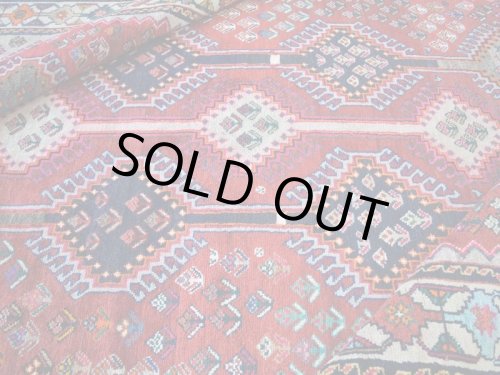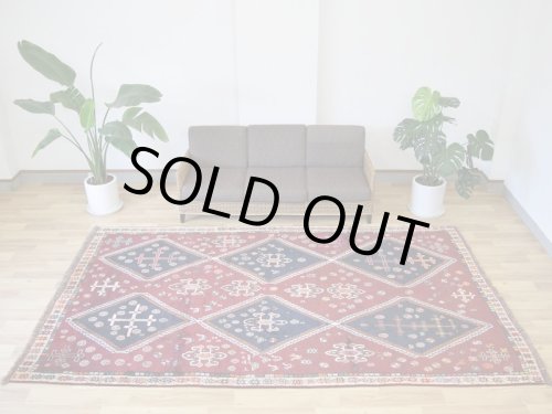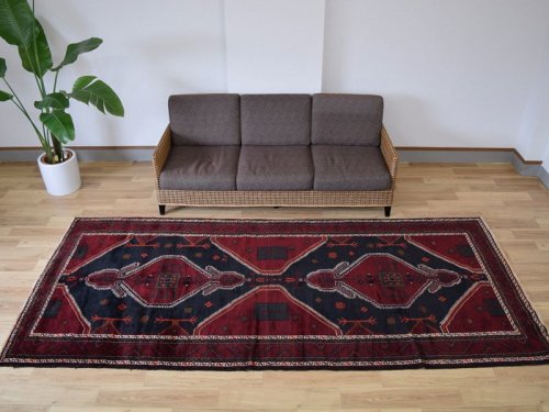 ----- 【状態詳細は、、、】 経年による柔らかさを帯びた毛足が毛流れ方向に寝ています。 経年20-30年程度のビンテージ品ですが、大きなスレ等ダメージもなく、まだまだこれから使用して頂ける良好な状態です。絨毯全体の毛足は、ふわりとした羊毛の1本1本が密集して毛流れの方向に寝ています。毛足表面は整えられています。 絨毯の毛足は豊富で、色合いの変化がある箇所等についても擦れて毛足が無くなっている様な形ではありません。 柔らかな良好状態の毛足で大きなスレ等ダメージはありません。 経年による色ムラ感のある色合いの毛足に関しても、良好な状態の毛足です。カスレて毛足がなくなっている様な事はありません。 豊富な毛足かつスレも無く、全体的な状態が良いGOODコンディションの良品と言えるヴィンテージ品で、本場イランでのクリーニングを経て気持ちよくお使いいただけます。 ----- 【サイズ感は、、、】 約6㎡・〜6帖程度のサイズ感で、リビングルームやダイニングルーム、客室等の2〜3人掛けソファやダイニングテーブルの足元、寝室のベッドサイドに敷くのに最適です。 オーディオに囲まれた音楽部屋や書斎、趣味の空間にもいいですね。 良いラグはあなたの空間を特別なものに変えてくれます。 ----- ***デザインやカラーリングについて*** ◆全体のデザイン◆ 直線的なデザインで描かれた幾何学模様を絨毯全体に規則的に並べた総柄のデザインです。 トルクメンの『ギュル(ゴル)』にも似た幾何学的な様々な形のメダリオンが配されています。 菱形の大きなトランジメダリオンが縦に3つ連なり、ネイビーの余白を埋める様に円形のメダリオンや幾何学模様のメダリオンが並びます。フィールドの余白やメダリオンの中にはSを横にした形の厄除けケルマック模様や、豊穣を願う星型模様等が散りばめられます。 ◆全体のカラーリング◆ 経年によりややムラ感のある色合いの変化を見せる良い味わいのネイビーやベージュ・茶系の濃淡をベースカラーにした配色です。経年のムラ感のある色合いの変化に伴い、まろやかな優しい色合いです。 縁取りに使用されている黒系の色合いは、経年変化により淡いかすれた様な色合いです。 絨毯の毛足は豊富で、色合いの変化がある箇所等についても擦れて毛足が無くなっている様な形ではありません。 経年の風合いあるふわりとした柔らかな毛足が、ギュルの模様と色合いをより味わい深い印象としてくれています。 やわらかで味わい深い毛足の流れに日差しが当たることや、見る向きや角度によって見え方が白っぽく反射する様な色合いから、深い色合いへ美しく変わります。