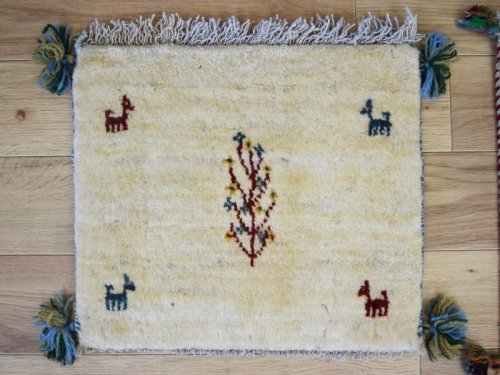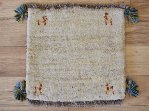新品 ペルシャ ギャッベ No.952 - 40 × 38 cm 座布団 クッションサイズ ラグ チェアマット 肉厚 天然 ウール ギャベ 手織り ロルバフト ハンドメイド ラグ 絨毯 カーペット 動物 柄 生成り クリーム ベージュ 原毛系 黄色 イエロー カラフル マルチカラー n-952-040038h010a310