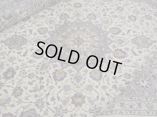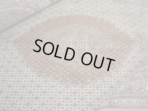 柔らかく良質なコルクウールとシルク糸を使用して緻密な模様を織りあげられた絨毯です。 状態の良い毛足で密に詰まった均一な毛足の立ち上がりもよく、クリームから白く反射する様に変化するフィールドの色合いの美しさが際立ちます。 絨毯全体の毛足は、1本1本のやわらかな毛足がみっしりと密集して、きめ細かです。 約0.8cm程度の毛足で、見た目にも柔らかな質感を感じる均一な立ち上がりの毛足です。 ボーダーにはフィールドのマヒ模様とは違ったメダリオンが織られており、シルク部分がウール部分に比べ沈み込むようになっています。 柔らかく上質な状態の毛足で大きなスレ等ダメージはなく、美しい色合いやふわふわとした柔らかなウールの良質さが際立ち、絨毯全体の印象を優しいものにしています。 とても美しい織で、良質な毛足に緻密に織られた織り地は美しい状態で手触り・色合い共に美しい状態です。 --------