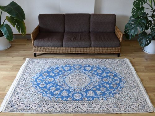 ◆全体のカラーリング◆ 絨毯全体に使用されたウールの優しい印象を与えるクリーミーな生成り色・ベージュ・クリーム、アイボリー、そしてフィールドに使用されたクリアで深みのあるグリーンの色合いがベースカラーとなっています。 ナインならではの全体に淡く優しい色合いが統一して使用され、王道のデザインと合わさってとても落ち着いた印象です。 花々等の模様にもベースカラーの同系色が多用され、統一された色合いを使うことで絨毯全体にも統一感を与えています。 キメ細かくふわりとした柔らかなウールの毛足にまろやかな色合いが染色され、やさしくクリーミーな色合いの印象を与えています。 ウールに染色されたそれぞれの色合いがクリーミーな印象を与え、王道デザインに色合いのコントラストがとても美しい絨毯です。 やや毛流れ方向に寝た毛足の流れに日差しが当たることや、見る向きや角度によって見え方が美しく変わります。 光の影響で、明るい水色から深い青の色合いに表情を変えます。 白っぽく反射するような色合いから、深くクリーミーな落ち着きあるまろやかな色合いへと表情を変化させてくれます。 日差し、影、部屋の電気、間接照明など、朝、昼、夜で違った顔を見せてくれるところも素晴らしいところです。 日々の暮らしの中で美しさに対する気づきをもたらしてくれます。 暮らしの中で年月と共に深まる風合いをお楽しみください。 *** ペルシャ絨毯には毛の流れがあり、一方向に羊毛が若干”ねている”様になっています。 大きなサイズのペルシャ絨毯になりますと、毛の流れに光が反射して、光の当たる方向によって、見え方も若干変化してまいります。 日光と共に表情を変える天然ウールの絨毯の毛並みを楽しめるのも大きなサイズならではです。