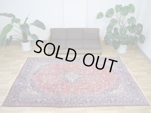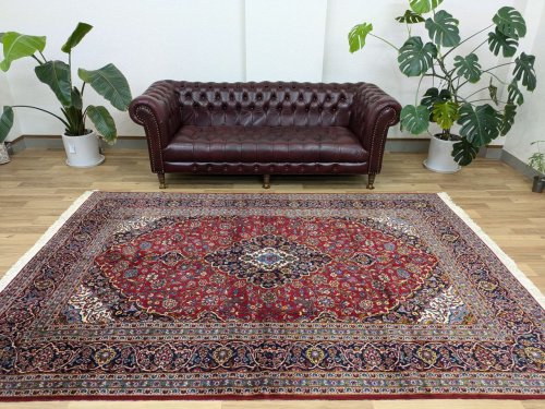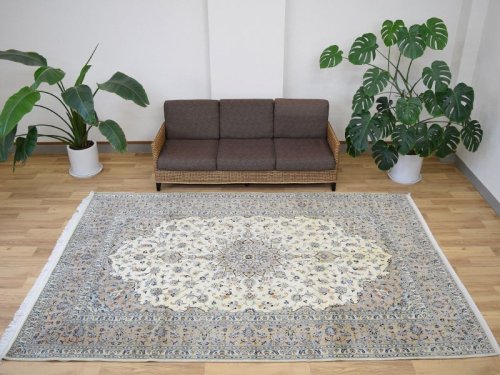 【見た目に、、、】 見た目にも肉厚な絨毯です。 絨毯のフィールドは見た目にも柔らかで良質なウールが使用され、クリーミーな色合いが優しい印象を与えます。 1本1本がふわふわとした柔らかな毛足はきめ細かで、ふわふわとした印象の立ち上がり良い毛足はセンターテーブル等を置いても非常に安定するしっかりとした織り地です。 近めにはマットな見た目、遠目にツヤ感の感じる毛足で、角度によってクリーミーな色合いから光が反射して輝くような色合いへと印象を変えます。 -------- 【触り心地は、、、】 毛足を面で触るともちもちとした低反発感ある弾力を感じる織り地です。 ふかふかとした触り心地はウールに包み込まれるようでとても安心感を与えてくれます。 1本1本がふわふわとしたきめ細かな毛足で立ち上がりの良い毛足の状態です。 簡単に捲れることのないしっかりとしたベースの織り地です。 みっしりと詰まった肉感を感じ、ふわふわとした毛足の肉感を感じます。 面でさわるとふわふわとした毛足の密集した肉感を感じる触り心地です。 柔らかな肉感と共に床面の感触が身体に伝わり、包み込まれるような安心感ある優しい感触を味わえます。 毛の流れに沿って寝た引き締まりの良い毛足に沿ってなでるとふわふわとした柔らかな触り心地です。 -------- 【詳細は、、、】 柔らかく良質なウールを使用して織りあげられた絨毯です。 経年〜20年程度のヴィンテージのお品ですが、状態の良い毛足で均一な毛足の立ち上がりもよくクリーミーな生成りの色合いとベージュの色合いが優しい印象と落ち着きを与えます。 絨毯全体の毛足は、1本1本のやわらかな毛足がみっしりと密集して、きめ細かです。 約1.2cm程度の毛足は見た目にも肉厚で均一な立ち上がりの毛足です。 柔らかな美品状態の毛足で大きなスレ等ダメージはなく、美しい色合いやふわふわとした柔らかなウールの良質さが際立ち、絨毯全体の印象を優しいものにしています。 -------- 【状態は、、、】 中古品に抵抗がある方にもお勧めできる美品状態です。 経年〜20年程度のビンテージ品ですが、良質な毛足に緻密に織られた織り地は美しい状態で手触り・色合い共に美しい状態です。 大きなダメージも無く、全体的な毛足の状態が良い美品と言えるヴィンテージ品で、本場イランでのクリーニングを経て気持ちよくお使いいただけます。 画像では確認できませんが薄い色ニジミが数箇所見られますが、使用に問題ございません。 -------- 【サイズ感は、、、】 約12㎡・10帖程度のサイズ感で、大判の絨毯はリビング・ダイニングルームや客室の中心に、コーナーソファの足元に敷いてお部屋をくつろぎの空間に変えてくれます。。。 ホテルや旅館、ペンション等の人の集まる場所にも最適な大きなサイズと上品な美しさです。 大きなサイズはホテルや旅館、ペンション等のお客様をおもてなしする場にも相応しい大きなサイズと良質な毛足、上品な美しさを兼ね備えた1枚です。 良いラグはあなたの空間を特別なものに変えてくれます。 -------- ***デザインやカラーリングについて*** ◆全体のデザイン◆ クム、イスファハーン、ナイン、タブリーズと並ぶペルシャ絨毯の5大生産地として知られているカシャーン産の絨毯は、全体に所狭しとアラベスク模様の花々が美しく咲き乱れるデザインが主流です。 こちらの絨毯は中央にメダリオンを配した『トランジ』デザインです。 中央にメダリオンをフィールドの四隅にコーナーメダリオンを配していることから『メダリオンコーナー』デザインとも呼ばれます。 バラやユリの断面をデザインしたシャーアッバス模様をあしらった、花や樹木を扱った花柄のアラベスク調の王道デザインです。 職人気質で、伝統的なデザインを重んじるカシャーンならではの花柄の模様が美しい王道の落ち着いたデザインです。 全体の優しい色合いと調和した美しいデザインが魅力的です。 王道デザインを好むカシャーン産の絨毯では、絨毯の中央に大きなメダリオンを配する古くから伝わるクラシックな王道デザインが一般的です。 ユリやダリヤの断面を描いたシャーアッバス模様の花々がきめ細かな毛足に美しく描かれています。