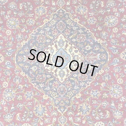 絨毯の裏を見ると、織り込まれた編目は細かくしっかりと密に並んでいます。 キメ細かなコットンの経糸にしっかりと織られた織地は、安定して滑りにくいです。 しっかりとコットンのたて糸に織り詰められた毛足は短くも腰があり、密集してしっかりとした手ごたえがあります。 使用された良質なウールは、みっしりと詰まった丈夫な毛足で、これから長く使用していけるお品です。 良質な毛足に緻密に織られた織り地は美しくクリアな状態で手触り・色合い共に美しい状態です。 新品ならではの光沢の少ないマットな毛足のツヤ感です。 画像にある黒っぽい影は折りジワです。敷いているうちに徐々に落ち着いてまいります。 -------- 【サイズ感は、、、】 約6㎡・〜6帖程度のサイズ感で、大判の絨毯はリビング・ダイニングルームや客室の中心に、3人掛けやコーナーソファの足元に敷いてお部屋をくつろぎの空間に変えてくれます。。。 ホテルや旅館、ペンション等の人の集まる場所にも最適な大きなサイズと上品な美しさです。 大きなサイズはホテルや旅館、ペンション等のお客様をおもてなしする場にも相応しい大きなサイズと良質な毛足、上品な美しさを兼ね備えた1枚です。 良いラグはあなたの空間を特別なものに変えてくれます。 -------- ***デザインやカラーリングについて*** ◆全体のデザイン◆ クム、イスファハーン、ナイン、タブリーズと並ぶペルシャ絨毯の5大生産地として知られているカシャーン産の絨毯は、全体に所狭しとアラベスク模様の花々が美しく咲き乱れるデザインが主流です。 こちらの絨毯は中央にメダリオンを配した『トランジ』デザインです。 中央にメダリオンをフィールドの四隅にコーナーメダリオンを配していることから『メダリオンコーナー』デザインとも呼ばれます。 バラやユリの断面をデザインしたシャーアッバス模様をあしらった、花や樹木を扱った花柄のアラベスク調の王道デザインです。 職人気質で、伝統的なデザインを重んじるカシャーンならではの花柄の模様が美しい王道の落ち着いたデザインです。 全体の優しい色合いと調和した美しいデザインが魅力的です。 王道デザインを好むカシャーン産の絨毯では、絨毯の中央に大きなメダリオンを配する古くから伝わるクラシックな王道デザインが一般的です。 ユリやダリヤの断面を描いたシャーアッバス模様の花々がきめ細かな毛足に美しく描かれています。 ◆全体のカラーリング◆ 絨毯全体に使用されたウールの優しい印象を与えるクリーミーな生成り色とメダリオンやボーダーに使用されたベージュ・ライトグレーがベースカラーとなっています。 全体に淡く優しい色合いが使用され、王道のデザインと合わさってとても落ち着いた印象です。 フィールドにはクリーム色が、中央のトランジメダリオンや四隅のラチャキトランジ、ボーダーにはグレーが使用されています。 花々等の模様には黄やピンク、ネイビーから水色等の青の濃淡や黄色の濃淡が多用され、統一された色合いを使うことで絨毯全体にも統一感を与えています。 キメ細かくふわりとした柔らかなウールの毛足にまろやかな色合いが染色され、やさしくクリーミーな色合いの印象を与えています。 経年の影響もあり、それぞれの色合いがクリーミーな印象を与え、王道デザインに色合いのコントラストがとても美しい絨毯です。 力強い縁取りが使用され、活き活きとした花々の模様を際立たせています。 やや毛流れ方向に寝た毛足の流れに日差しが当たることや、見る向きや角度によって見え方が美しく変わります。 白っぽく反射するような色合いから、深くクリーミーな落ち着きあるまろやかな色合いへと表情を変化させてくれます。 日差し、影、部屋の電気、間接照明など、朝、昼、夜で違った顔を見せてくれるところも素晴らしいところです。 ◆各部位の説明◆ ◇トランジメダリオン◇ 絨毯の中心には宇宙の中心を意味すると言われる『トランジ』と呼ばれる中央のメダリオンが配されています。 大きく配された美しいメダリオンはカシャーンならではです。 中心には小花の模様が配され、色分けされたそれぞれのメダリオンの中に小花がちりばめられています。 中心の小花を囲むパートは淡い水色からフィールドと同様のクリームがかった生成りの色合いへとグラデーションになっています。 太陽が放射する様にメダリオンに配された花々がフィールドに広がっていきます。 中心から淡い水色から生成りへのグラデーション→生成り→グレーと配色がされていて、メダリオンの外側にはフィールドへ放射していくように花々がデザインされています。 トランジメダリオンの中に配された花々は優しい色合いで織り上げられ、色合いで美しく規則的に配されています。