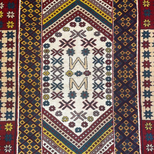 【サイズ感は、、、】 約3.0㎡・〜3.5帖程度のサイズ感で、リビング・ダイニングルームや客室の中心に、3人掛けやコーナーソファの足元に敷いてお部屋をくつろぎの空間に変えてくれます。。。 2〜3人掛けのソファーの前に敷いて、ローテーブルを置くことの出来るサイズです。 ダイニングルームや寝室、書斎や趣味の部屋にもアクセントとして活躍します。 寝室ではベッドサイドに敷くことで、1日の始まり、1日の終わりを特別な気持ちで過ごすことが出来ます。 ホテルや旅館、ペンション等のお客様をおもてなしする場にも相応しい大きなサイズと良質な毛足、上品な美しさを兼ね備えた1枚です。 手織りウールは冬あたたかく、夏はさらりとした質感で通年敷いていただけます。 良いラグはあなたの空間を特別なものに変えてくれます。 -------- ***デザインやカラーリングについて*** ◆全体のデザイン◆ 絨毯の中央に3連のメダリオンを配したデザインです。 メダリオンはトランジと呼ばれ、宇宙の中心を指しているとも言われています。 直線的に描かれたジオメトリックなデザインのこの絨毯は、シラーズを拠点にする遊牧民であるカシュガイ族特有のデザインであるヘイバトルー柄にも似ています。 小さいメダリオンと大きなコーナーが特徴的で、フィールドやコーナーの中には細かな幾何学的な模様のメダリオンモチーフや、豊穣を願う星のモチーフ、健康長寿の願いが込められた生命の樹のモチーフや、厄除けのメダリオン等のシンボルがちりばめられ、素朴でポップな印象もあります。 様々なモチーフが描かれた見ていて飽きない素敵なデザインです。 統一感ある色合いを使用して織り上げられたデザインはまとまりがあり、トゥーマッチな印象は与えません。 ◆全体のカラーリング◆ 赤、ネイビー、イエローがかったクリームの色合いがベースカラーとなっています。 肉感あるウールの毛足にまろやかな色合いが染色され、やさしくマイルドな色合いの印象を与えています。 フリンジ房はムラ感のある赤系の色合いで染められています。 力強い直線的なデザインは幾何学的な模様の美しさを際立たせています。 やや毛羽立つ様な肉厚な毛足の毛流れに日差しが当たることや、見る向きや角度によって見え方が美しく変わります。 白っぽく反射するような色合いから、深く落ち着きあるまろやかな色合いへと表情を変化させてくれます。 日差し、影、部屋の電気、間接照明など、朝、昼、夜で違った顔を見せてくれるところも素晴らしいところです。 毛足の流れがあることにより、日差しや明かり、見る角度による見え方の違いが楽しめます。 淡く優しい色合いは、日中と夜の見え方の違いがとても面白く、昼間は日差しの反射で艶々と反射して見えるような見た目が、夜は間接照明などでより深く、落ち着いた佇まいを見せてくれます。 日々の暮らしの中で美しさに対する気づきをもたらしてくれます。