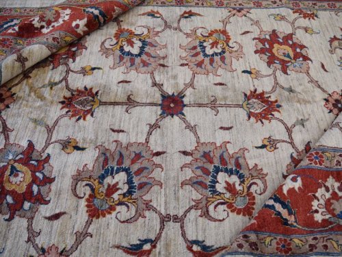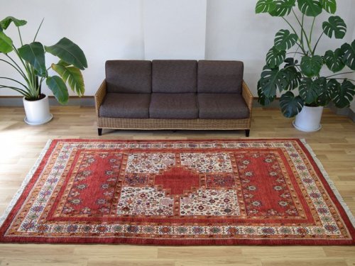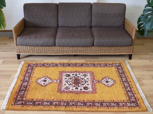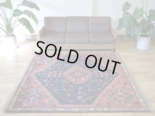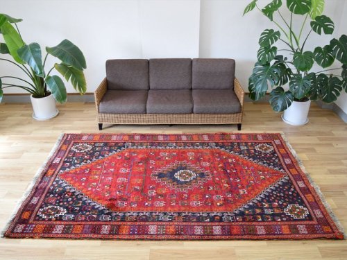 イラン・シラーズで作られたビンテージのウール手織り部族絨毯です。 経年のウール色合いの変化や毛足の柔らかな手触り等、味わい深いです。 リビングルームやダイニングルーム、客室、寝室を特別なくつろぎの空間にしてくれます。 イラン本国で専門業者によるクリーニング・メンテナンスを経て気持ちよくお使いいただけます。 ----- 【見た目に、、、】 経年によりふわりとした柔らかさを帯びた毛足が、毛流れの方向にやや寝ています。 ざっくりと太めの毛足で織られたウールパイルで見た目にも肉感があります。 ややや毛羽立つ様な毛足の手触りは経年による程よい柔らかな印象があり、見た目の肉感にも経年の味わい深い風合いがあります。 メダリオンやボーダー、フィールドの花模様は、時を経てムラ感ある色合いに色落ちして味わい深い風合いを感じさせます。 経年の色合い変化のある部分について毛足がカスレている様な事はありません。 時を経て味わい深い色合いとやわらかな毛足を携えた良品といえるコンディションです。 近めにマットな質感で遠目に見ると光沢するツヤ感を感じる毛足です。 ムラ感のある色合いの変化も合わさり、見る角度や照明の影響から光沢感等の色合い変化を感じる事の出来る味わい深い印象です。 ----- 【触り心地は、、、】 1本1本が柔らかな肉感の表地ウール毛足で、面で触ると低反発感あるほんのりとした弾力を感じる触り心地です。 やや毛流れに寝た毛足を毛流れ方向に沿って撫でるとウールのふわりとした手触りです。 持ち上げるとくたっととする肉感を感じる柔らかな織り地です。 ◆手触り◆ 持ち上げるとくにゃりとした柔らかな肉感ある織り地で、ふわふわと詰まったウールの確かな肉感を感じ、歩いたり、腰を下ろした際には、ウールの厚みを感じさせ、やわらかな毛足の感触が床面の感触と共に伝ってきます。 暮らしの中で年月と共に深まる風合いをお楽しみください。 ----- 【状態詳細は、、、】 経年30年-程度のビンテージの絨毯です。 経年のくたっとする柔らかく良質な毛足で、肉感があり、スレ等のダメージのない良品のビンテージ絨毯です。 良好な状態で、スレ等がなくやわらかなウールの肉感を感じます。 厚みが約1.0cm程度の表地毛足で、ウール縦糸で織られた織り地のベースは、経年のくたっとした織り地のやわらかさを感じます。 絨毯全体の毛足は、豊富でふわりとした羊毛の1本1本が密集しています。 経年による柔らかさを帯びた毛足が毛流れ方向にやや寝ている状態です。 絨毯の裏を見ると、織り込まれた編目は細かくしっかりと密に並んでいます。 経年による色ムラ感のある個所に関しても、良好な状態の毛足です。 肉感のあるウールはダメージは見受けられず、カスレて毛足がなくなっている様な事はありません。 豊富な毛足かつスレも無く、全体的な状態が良いGOODコンディションの良品と言えるヴィンテージ品で、本場イランでのクリーニングを経て気持ちよくお使いいただけます。 ----- 【サイズ感は、、、】 約2.9㎡・2〜3帖程度のサイズで、リビングルームやダイニングルーム、客室等の2~3人掛けソファやダイニングテーブルの足元、寝室のベッドサイドに敷くのに最適です。 オーディオに囲まれた音楽部屋や書斎、趣味の空間にもいいですね。 良いラグはあなたの空間を特別なものに変えてくれます。 ----- ***デザインについて*** ◆全体のデザイン◆ 絨毯の中央にメダリオンが連なるシラーズならではのデザインです。 メダリオンはトランジと呼ばれ、宇宙の中心を指しているとも言われています。 メダリオンには、幸せを運ぶ神様の使者と言われる鳥のモチーフが描かれています。メダリオンだけでなくフィールドの様々なところに 直線的に描かれたジオメトリックなデザインの絨毯です。 中央のメダリオンの他、フィールドには絨毯の上下に幹が伸びて生命力を感じさせる花の模様や、「横S」で描かれた厄除けのケルマック模様等、様々なイラン遊牧民のシンボルが散りばめられています。 *** ペルシャ絨毯は日本の家屋ともよい相性で、日本家屋や古い和箪笥等の和の装いを纏った空間にも適しております。 リビングルームでは3人掛けのカウチソファーの前に敷きテーブルを置くことのできるサイズです。 ダイニングルームでテーブル下に敷いて、食卓を明るくしてくれます。 寝室に敷くことで1日の始まり、1日の終わりを特別な気持ちで過ごすことが出来ます。 客室等、特別な空間に敷くことで絵画の様に空間を素敵な雰囲気に変えてくれます。 書斎のデスクの足元や音楽スペースなど、自分だけの特別な空間に敷くのも気持ちの良いものです。 ペルシャ絨毯の緻密なデザインを楽しみつつ、天然ウールのやさしさをたっぷり楽しめます。 床に絵を飾っている様に、毎日過ごすお部屋を素敵な空間にしてくれます。 お部屋のアクセントに是非どうぞ。 味のある家具やアンティークインテリア、コーヒーテーブ