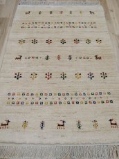 ***デザインやカラーリングについて*** ◆全体のデザイン◆ 生成り色のウールで手織りしたシンプルなデザインです。 絨毯の四隅には1頭ずつ鹿のモチーフが織られています。 鹿のモチーフは家庭円満や家内安全、子供の健やかな成長などを願った意味合いが込められた遊牧民のシンボルです。 ----- ◆全体のカラーリング◆ フィールドの生成りの色合いがベースカラーになっています。 見る角度や照明の具合によって反射するような白からクリーム系の色合いに表情の印象を変えてくれます。 生成り色のウールの色合いとふわふわとした見た目は優しく柔らかな印象を与えています。 四隅に配置された鹿のモチーフは青と黄色の色合いを使用して織られ、淡く優しい印象のあるその色合いはウールに草木染されたまろやかさを感じさせます。 角度により、遠目に見るとツヤ感を感じ、反射するような白い色合いからまろやかな色合いへと表情を変化させてくれます。 全体に近め見るとにマットな印象を与える毛足のツヤ感です。