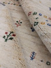 ----- 【見た目に、、、】 みっしりと詰まった分厚い毛足が立ち上がり、見た目にも肉厚です。 ギャベならではのふかふかとした柔らかな毛足が毛流れ方向にやや傾く様に並び肉感を感じます。 生成り色のウール毛足がベースカラーとなっています。 生成り色の優しい色合いがふかふかとした毛足の見た目をより一層優しい印象にしてくれます。 近めに見るとマットな質感を感じる毛足です。