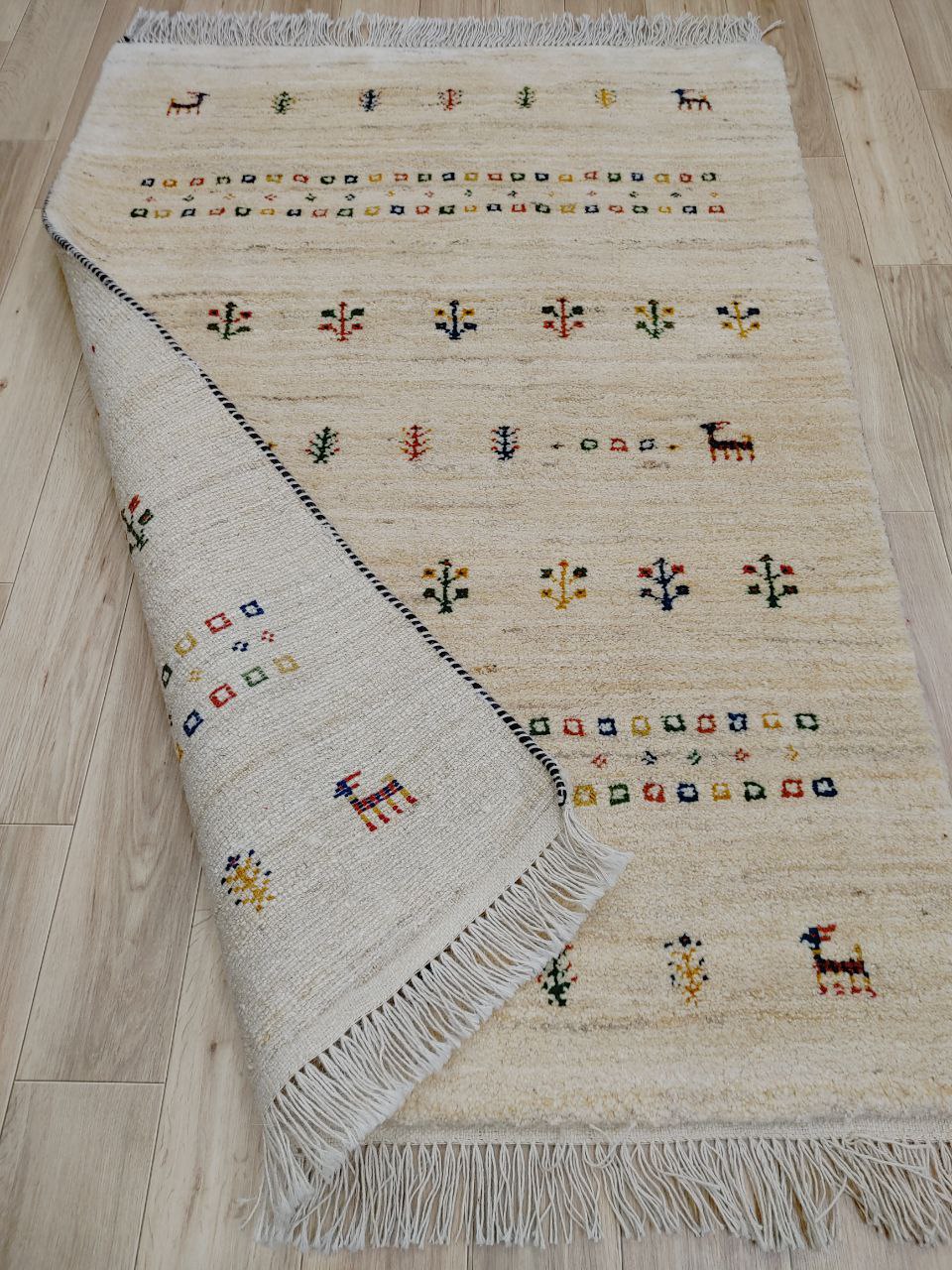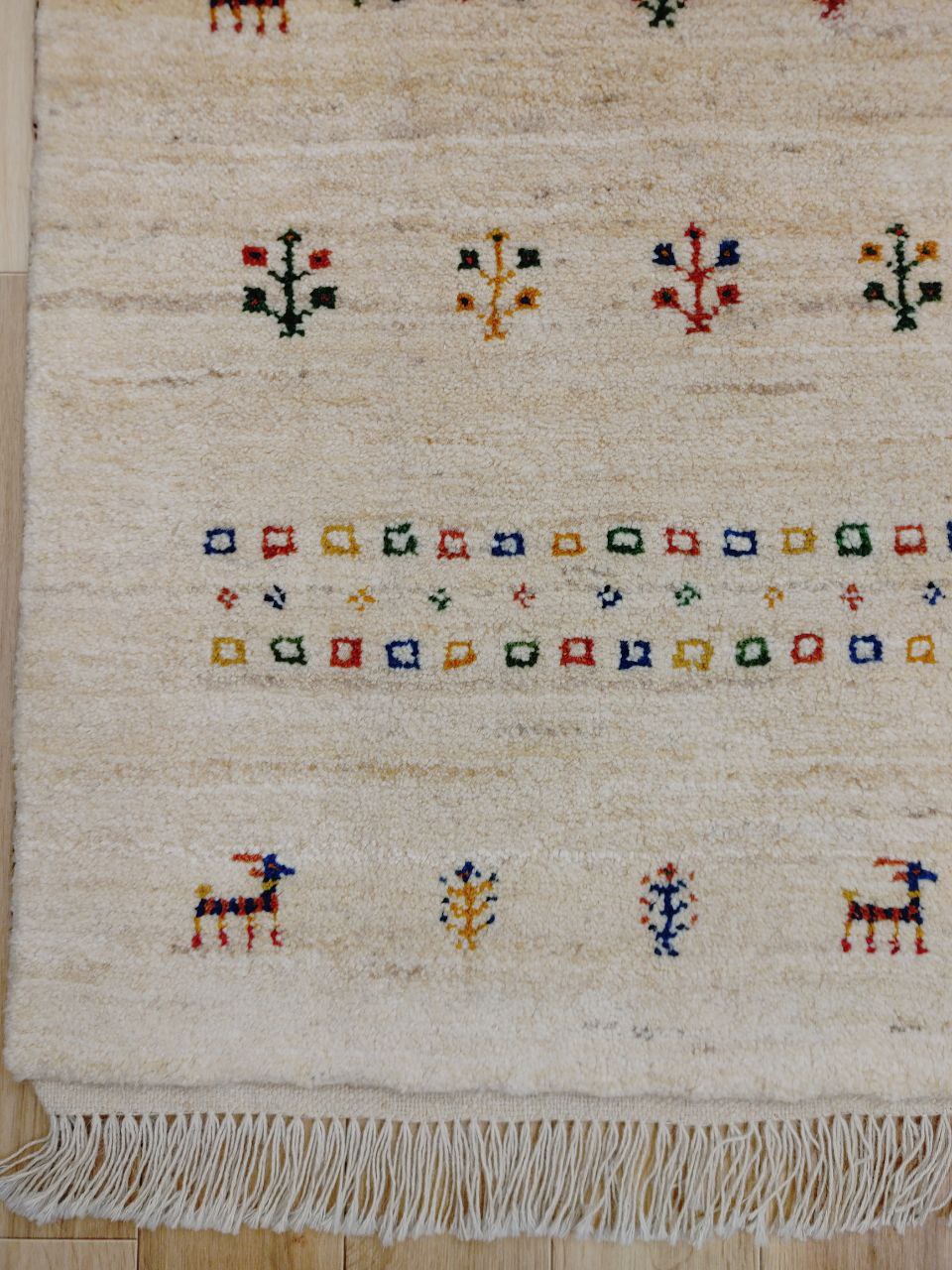 ----- 【状態詳細は、、、】 絨毯全体の毛足は、ふわりとした羊毛の1本1本が密集して立ち上がっています。 毛足表面は均一に整えられています。 約2.0cm程度のウールパイルの肉感ある分厚い毛足は、1本1本がふわりとした均一な立ち上がりで、見た目にもふわふわとした印象です。 持ち上げるとくにゃりとする柔らかな織り地のベースです。 新品未使用のギャッベで、あなたの暮らしの営みと共に時間を歩む事の出来る、これから長くご使用いただけるお品です。