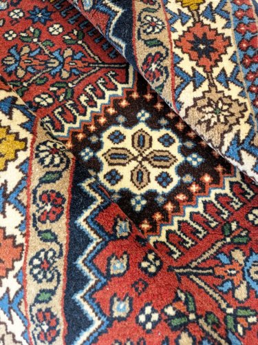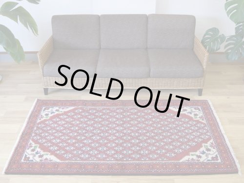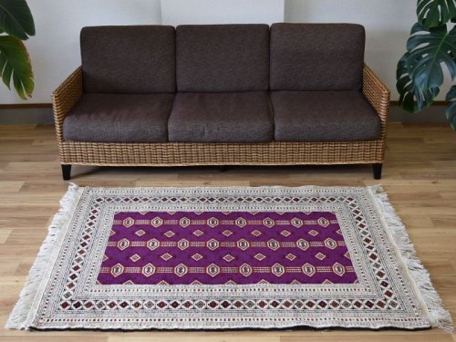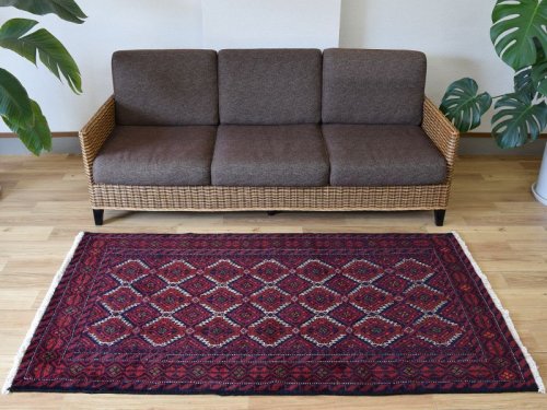 *** イランで作られた新品未使用ののバルーチ族のウール手織りペルシャ部族絨毯です。 バルーチならではの黄色やエンジを使用した色合いと幾何学模様がとてもよくマッチしています。 キメ細かくさらりとして、みっしりと詰まった肉厚な毛足です。 イラン本国での専門業者によるクリーニングメンテナンスを経て、日本へ輸入しております。 -------- 【見た目に、、、】 見た目にも肉感のあるみっしりと並んだ毛足に、落ち着きを感じるエンジ系の赤のと優しい印象のクリーム/生成り/白系のウール毛足色合いコントラストが美しい1枚です。 近めにはマットな見た目、遠目にツヤ感の感じる毛足で、角度によってクリーミーな色合いから光が反射して輝くような色合いへと印象を変えます。 -------- 【触り心地は、、、】 持ち上げるとくたっとする程度の厚みを感じる織り地で、ウール毛足の柔らかな肉感があります。面で触ると詰まった毛足のみっしりと並んでやや低反発感のある弾力を感じます。 毛足に沿って撫でるとふわりとしたウールの感触です。 柔らかな肉感と共に床面の感触が身体に伝わり、包み込まれるような安心感ある優しい感触を味わえます。 -------- 【状態詳細は、、、】 ウール手織りの絨毯です。 柔らかく良質なウールを使用して緻密な模様を織りあげられた絨毯です。 深く落ち着いた色合いから白く反射する様に変化するフィールドの色合いの美しさが際立ちます。 絨毯全体の毛足は、1本1本のやわらかな毛足がやや毛羽立つ様にゆるやかにと密集しています。 約1.0cm程度の肉感ある毛足は表面にやや毛羽立ち感があり、見た目にも肉感を感じる均一な立ち上がりの毛足です。 柔らかな毛足がお互いを毛流れ方向に支え、きめ細かな立ち上がりを見せています。 絨毯の裏を見ると、織り込まれた編目はみっちりと密に並んでおります。 毛足やセルビッチ(大外の縁取り)の大きなダメージも見受けられず、状態の良い良品です。 経年の影響でムラ感のある変化を見せる色合いも、色合いはカスレ感がありますが、実際の毛足にスレ等のダメージは見受けられません。 柔らかな良品状態の毛足で、大きなダメージはなく、美しい色合いやふわふわとした柔らかなウールの良質さが際立ち、絨毯全体の印象を優しいものにしています。 本場イランでのクリーニングを経て気持ちよくお使いいただけます。 良品と呼べるお品ですが、あくまでも新品同様ではなくヴィンテージ品としてのグッドコンディション品とお考え下さい。 -------- 【サイズ感は、、、】 約1.7m〜2帖程度のサイズで、リビングルーム、客室等の1-2人掛けソファやダイニングテーブルの足元、寝室のベッドサイドに敷くのに最適です。 テーブルやデスクの足元、キッチンの棚の足元や観葉植物の下敷き、書斎や音楽部屋や趣味の空間にもいいですね。 良いラグはあなたの空間を特別なものに変えてくれます。 -------- やや毛羽立つ様な肉厚な毛足の毛流れに日差しが当たることや、見る向きや角度によって見え方が美しく変わります。 白っぽく反射するような色合いから、深く落ち着きあるまろやかな色合いへと表情を変化させてくれます。 日差し、影、部屋の電気、間接照明など、朝、昼、夜で違った顔を見せてくれるところも素晴らしいところです。 毛足の流れがあることにより、日差しや明かり、見る角度による見え方の違いが楽しめます。 淡く優しい色合いは、日中と夜の見え方の違いがとても面白く、昼間は日差しの反射で艶々と反射して見えるような見た目が、夜は間接照明などでより深く、落ち着いた佇まいを見せてくれます。 日々の暮らしの中で美しさに対する気づきをもたらしてくれます。 暮らしの中で年月と共に深まる風合いをお楽しみください。 *** ペルシャ絨毯には毛の流れがあり、一方向に羊毛が若干”ねている”様になっています。 大きなサイズのペルシャ絨毯になりますと、毛の流れに光が反射して、光の当たる方向によって、見え方も若干変化してまいります。 日光と共に表情を変える天然ウールの絨毯の毛並みを楽しめるのも手織りならではです。 *** リビングルームの中心に、2〜3人掛けのカウチソファーやコーナーソファの足元に敷いて、テーブルも置くことのできるサイズです。 ダイニングルームでテーブル下に敷いて、食卓を明るくしてくれます。 寝室に敷くことで、1日の始まり、1日の終わりを特別な気持ちで過ごすことが出来ます。 ペルシャ絨毯の緻密なデザインを楽しみつつ、天然ウールのやさしさをたっぷり楽しめる贅沢なサイズです。 床に絵を飾っている様に、毎日過ごすお部屋を素敵な空間にしてくれます。 お部屋のアクセントに是非どうぞ。 味のある家具やアンティークインテリア、コーヒーテーブル等と良い相性です。 お家のフローリング、カフェ、アパレルセレクトショップやヘアサロン内装等、多くの用途にご使用いただけます。 |