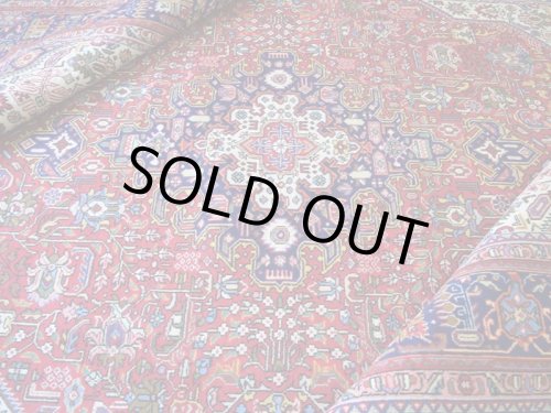 【状態は、、、】 タブリーズの良質なウールを使用して織りあげられた絨毯です。 経年〜30年程度のビンテージ品ですが、状態の良い毛足です。 主にフィールドのブルーやグリーンの毛足表面にムラ感ある経年の色合い変化が見られますが、美しい味わいとして感じられ、それにより毛足がくたびれてダメージとなっている様な印象は与えません。 キメ細かく毛足は短く均一に整っており、ぺたりと毛流れの方向に寝ています。 絨毯の色合いや模様を一層美しい印象として引き立てています。 毛足やセルビッチ(大外の縁取り)の大きなダメージも見受けられず、状態の良いGOODコンディションのお品です。 全体的な状態が良いGOODコンディションのヴィンテージ品で、大きなスレ等のダメージもなく、本場イランでのクリーニングを経て気持ちよくお使いいただけます。 -------- 【サイズ感は、、、】 約8.6㎡・〜9帖程度のサイズ感で、大判の絨毯はリビング・ダイニングルームや客室の中心に、3人掛けソファやコーナーソファの足元に敷いてお部屋をくつろぎの空間に変えてくれます。。。 ホテルや旅館、ペンション等の人の集まる場所にも最適な大きなサイズと上品な美しさです。 大きなサイズはホテルや旅館、ペンション等のお客様をおもてなしする場にも相応しい大きなサイズと良質な毛足、上品な美しさを兼ね備えた1枚です。 良いラグはあなたの空間を特別なものに変えてくれます。 -------- ***デザインやカラーリングについて*** ◆全体のデザイン◆ こちらの絨毯は中央にメダリオンを配した『トランジ』デザインです。 中央にメダリオンをフィールドの四隅にコーナーメダリオンを配していることから『メダリオンコーナー』デザインとも呼ばれます。 高い絨毯製作の技術を持つタブリーズでは実に様々なデザインが織られます。 こちらのデザインはペルシャ絨毯のアラベスク調のデザインをデジタルのフィルターを通した様に直線的に描かれています。トルコにほど近いタブリーズならではのトルコキリム等の影響も感じさせる幾何学的なデザインです。 幾何学的な直線で描かれたデザインと花模様等にもみられる曲線のデザインが見事に融合しています。 中央にダイナミックにメダリオンを配し、フィールドの余白に沢山の花々を配したデザインです。 力強い縁取りと花々のカラフルな色合いが生命力にあふれ、メダリオン等に配された葉のデザインはまるで炎が燃えるように躍動しています。 全体にやや幾何学的で細かな模様が配されていますが、配色の統一、デザインのバランスが落ち着きを与えてくれる王道のデザインと言えます。 見ていて飽きの来ない、見ていると様々な発見のある素敵な絨毯です。 ◆全体のカラーリング◆ フィールドやボーダーの大部分を占めるクリアな赤がベースカラーとなっています。 ハッキリとした赤の色合いですが、経年による角の取れた様なまろやかな色合いで、目に痛い色ではありません。 絨毯の毛足の色合いは全体的に、経年による色合いの変化のため、クリアですがまろやかで優しい色合いの印象です。 ネイビーや青系の色合いを中心にややムラ感のある色落ちを見せています。 経年による色ムラ感のある色合いの毛足に関しても、良好な状態の毛足です。カスレて毛足がなくなっている様な事はありません。 絨毯全体に配された花々や草木やメダリオン等の細かな装飾には生成り色や黄、ピンク、グリーン、オリーブ等の色合いが使用され、全体的にカラフルですが、統一された色合いを使用し絨毯に落ち着きを与えています。 キメ細かくふわりとした柔らかなウールにまろやかな色合いが染色され、そこに経年の色合い変化や引き締まりを見せた毛足が、やさしくクリーミーな色合いの印象を与えています。
