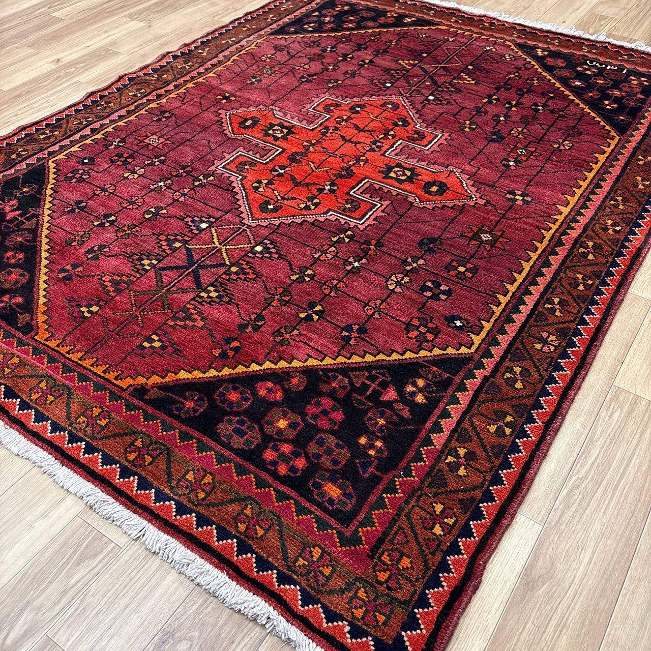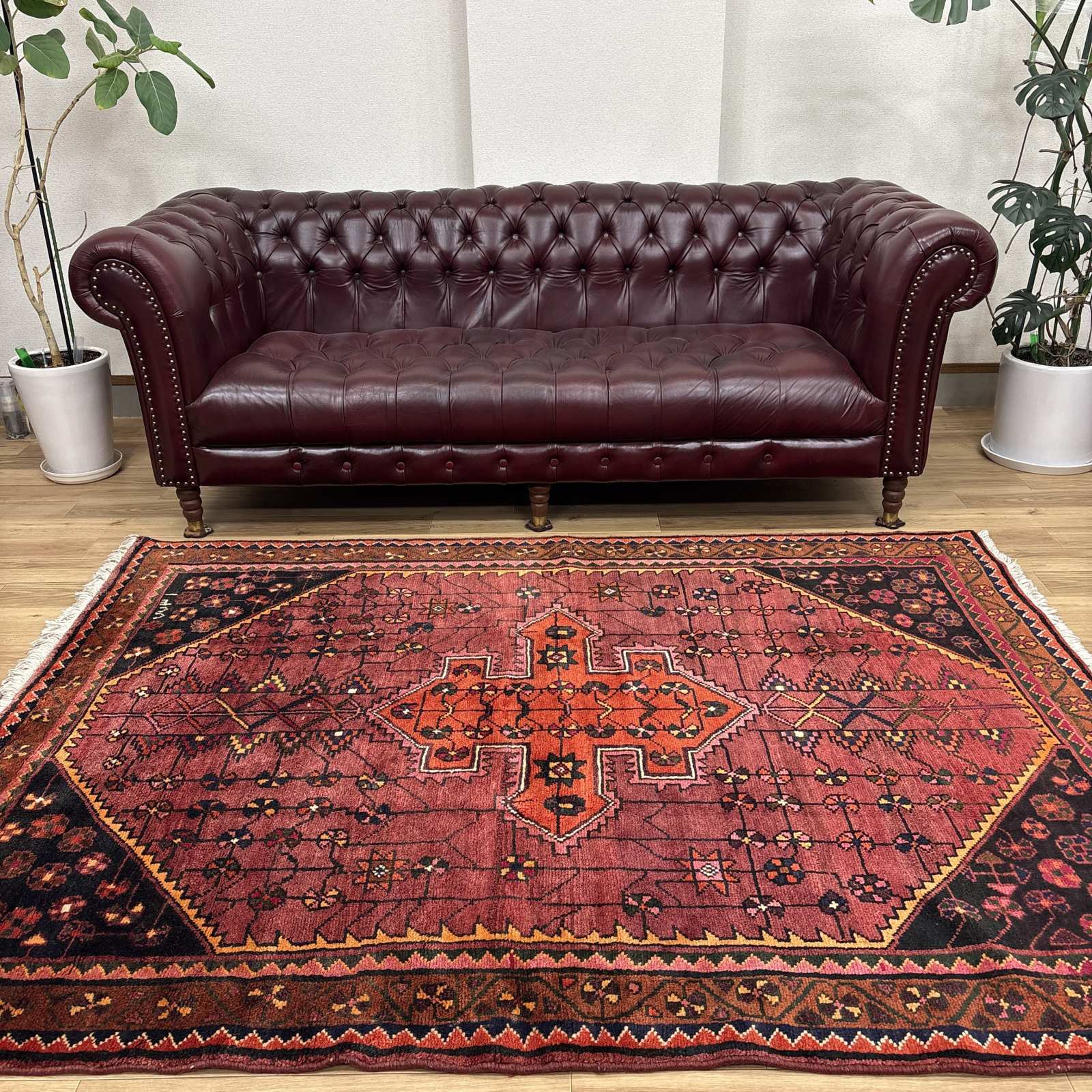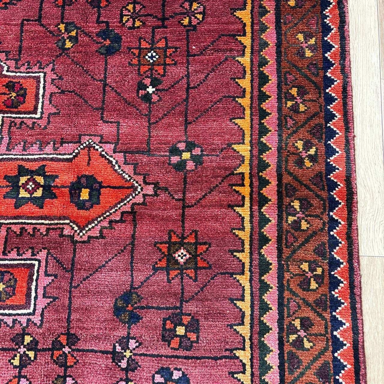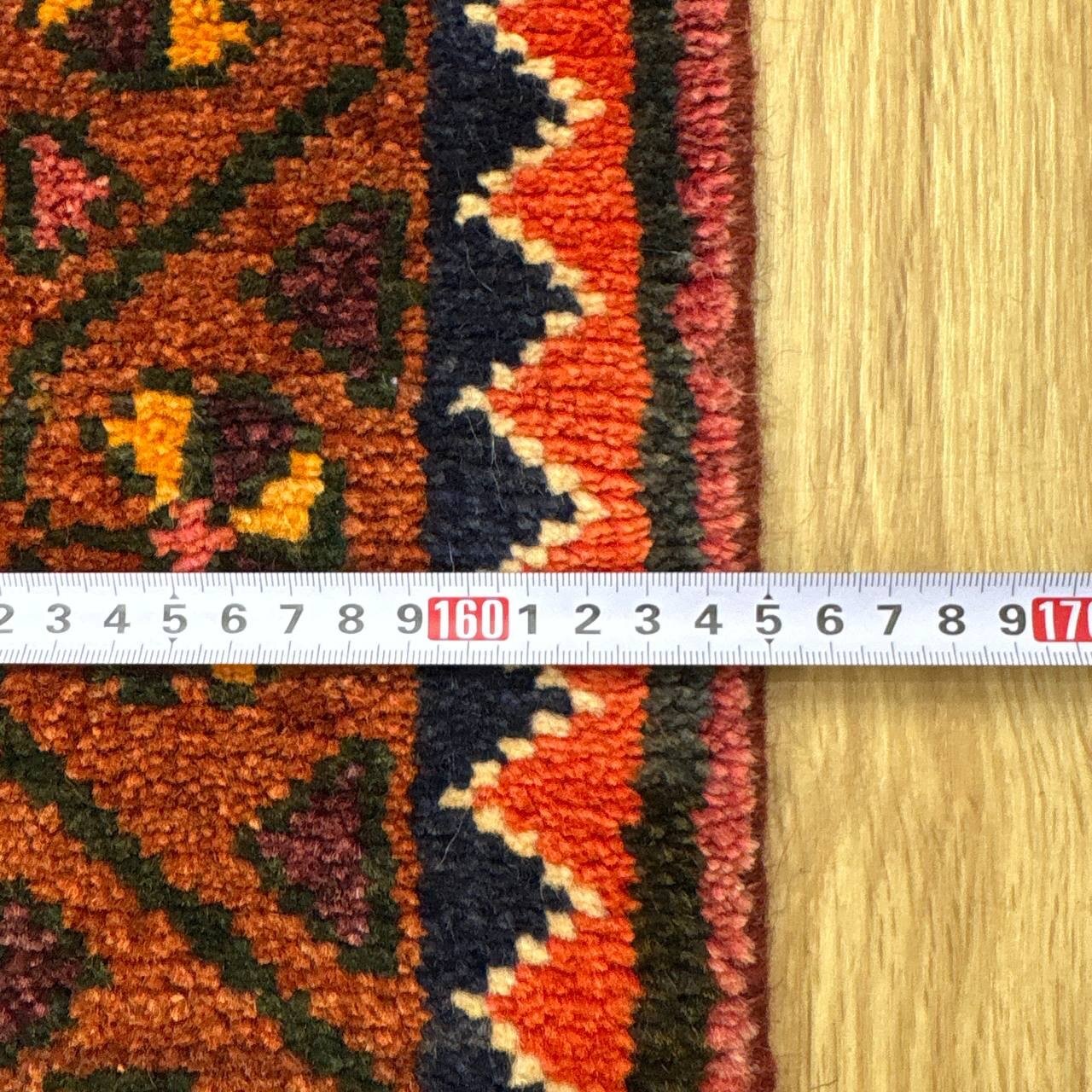 -------- 【触り心地は、、、】 面で触ると柔らかく豊富な毛足の密に詰まったコシのある弾力を感じる織り地です。 毛足に沿って撫でるとふわりとやわらかな毛足の肉感も感じることが出来ます。 ウールの経糸にしっかりとした織られた織り地にはコシのある弾力で、歩いたり、腰を下ろした際には柔らかな弾力とウールの厚みを感じさせ弾力あるやわらかな毛足の感触が床面の感触と共に伝ってきます。 柔らかな触り心地は、床面の感触と共にほのかに伝わり、ウールに包み込まれるようでとても安心感を与えてくれます。 絨毯の上で膝立ちしても床面の感触が少ない柔らかな肉感があります。 ウールパイルの1本1本がふわふわとしたきめ細かな毛足で、キメの細かい織にウールの1本1本が互いを支えコシのある立ち上がりの良い毛足の状態です。 密集し、均一に立ち上がった引き締まりの良い毛足に沿ってなでるとふわふわとした柔らかな触り心地です。 暮らしの中で年月と共に深まる風合いをお楽しみください。 -------- 【状態詳細は、、、】 柔らかく良質なウールを使用して緻密な模様を織りあげられた絨毯です。 豊富な毛足が詰まった肉感があり、ウール縦糸で織られた織地はしっかりとして、柔らかな毛足を携えています。 毛足の立ち上がりもとてもよく、絨毯全体の毛足は、1本1本のやわらかな毛足がみっしりと密集して、きめ細かです。 絨毯の裏を見ると、織り込まれた編目は細かくしっかりと密に並んでいます。 約1.3cm程度の肉感ある毛足で、見た目にも柔らかな質感を感じる均一な立ち上がりの毛足です。 豊富で肉感のある毛足ですが、毛足のやや長い箇所、やや短い箇所があります。使用に問題はございません。 使用された良質なウールは、みっしりと詰まった丈夫な毛足で、これからも長く使用していけるお品です。 -------- 【サイズ感は、、、】 2〜3人掛けソファーの前やベッドサイドにオススメのサイズ感です。 ソファーの前やベッドサイドにオススメです。 ごろんと横になって身体を預けるのも気持ちが良いものです。 リビングルームや寝室、音楽部屋や趣味の空間等々マルチに活躍するサイズ感です。 棚、チェストの足元やストーブの前等アクセントに最適です。 取り回しも簡単なサイズ感なので、気分や季節で配置を変更するのも気軽です。 良いラグはあなたの空間を特別なものに変えてくれます。 -------- ***デザインについて*** ◆全体のデザイン◆ 絨毯の中央のメダリオンを配したデザインで、シラーズのヘイバトルーに似たデザインにカギ型の縁取りを持ったメダリオンが並ぶ様はヤラメ絨毯のオーソドックスな王道のデザインです。 メダリオンはトランジと呼ばれ、宇宙の中心を指しているとも言われています。 トランジの縁取りにはランニングドッグ(走る犬)柄と呼ばれる鈎型の犬の歯を模した文様が配されており、家内安全の意味合いを持っています。 抽象化された模様は犬の形を成していませんが、一般的に古代から動物のモチーフには守護の意味合いが多くみられ、外敵から生活を守るといった意味合いが伺えます。 直線的に描かれたジオメトリックなデザインのこの絨毯は、シラーズを拠点にする遊牧民であるカシュガイ族特有のデザインであるヘイバトルー柄にも似ています。 小さいメダリオンと大きなコーナーが特徴的で、フィールドやコーナーの中には細かな幾何学的な模様のメダリオンモチーフや、神様の使者とされる鳥のモチーフ、Sを横にした形の厄除けケルマック模様や、健康長寿の願いが込められた生命の樹のモチーフや、厄除けのメダリオン等のシンボルがちりばめられ、素朴でポップな印象もあります。 様々なモチーフが描かれた見ていて飽きない素敵なデザインです。 ***