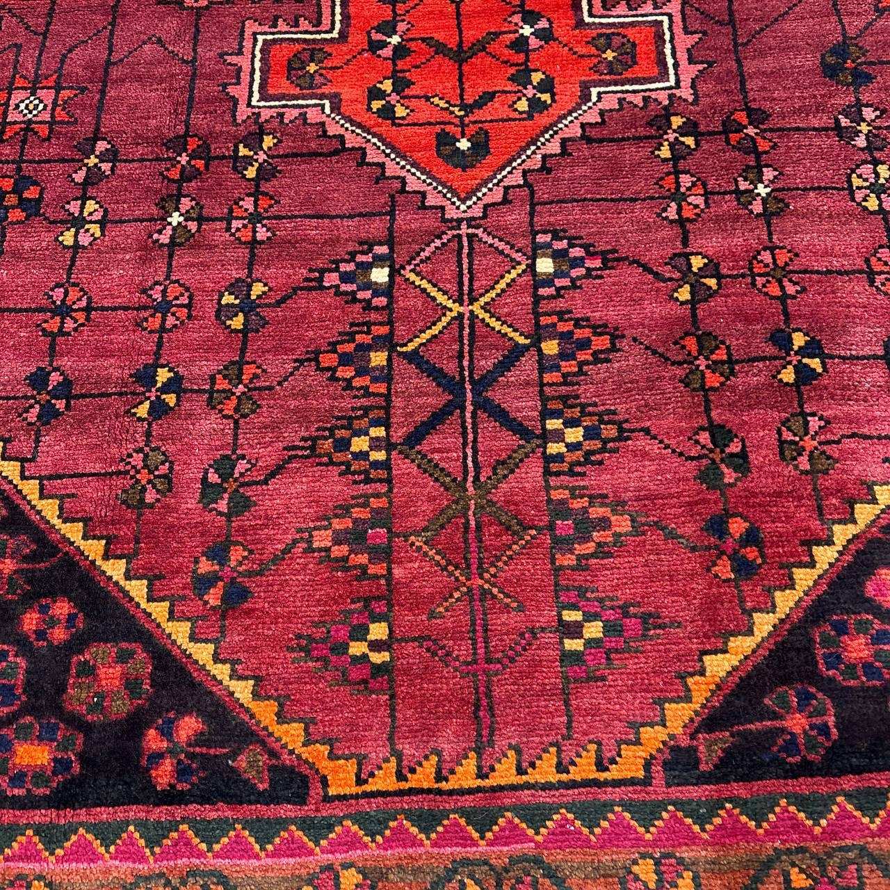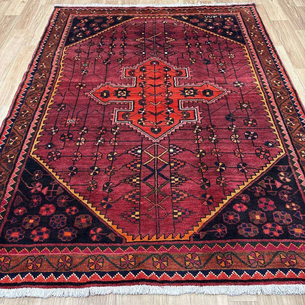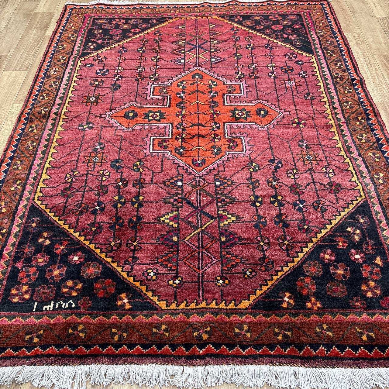-------- 【触り心地は、、、】 面で触ると柔らかく豊富な毛足の密に詰まったコシのある弾力を感じる織り地です。 毛足に沿って撫でるとふわりとやわらかな毛足の肉感も感じることが出来ます。 ウールの経糸にしっかりとした織られた織り地にはコシのある弾力で、歩いたり、腰を下ろした際には柔らかな弾力とウールの厚みを感じさせ弾力あるやわらかな毛足の感触が床面の感触と共に伝ってきます。 柔らかな触り心地は、床面の感触と共にほのかに伝わり、ウールに包み込まれるようでとても安心感を与えてくれます。 絨毯の上で膝立ちしても床面の感触が少ない柔らかな肉感があります。 ウールパイルの1本1本がふわふわとしたきめ細かな毛足で、キメの細かい織にウールの1本1本が互いを支えコシのある立ち上がりの良い毛足の状態です。 密集し、均一に立ち上がった引き締まりの良い毛足に沿ってなでるとふわふわとした柔らかな触り心地です。 暮らしの中で年月と共に深まる風合いをお楽しみください。 -------- 【状態詳細は、、、】 柔らかく良質なウールを使用して緻密な模様を織りあげられた絨毯です。 豊富な毛足が詰まった肉感があり、ウール縦糸で織られた織地はしっかりとして、柔らかな毛足を携えています。 毛足の立ち上がりもとてもよく、絨毯全体の毛足は、1本1本のやわらかな毛足がみっしりと密集して、きめ細かです。 絨毯の裏を見ると、織り込まれた編目は細かくしっかりと密に並んでいます。 約1.3cm程度の肉感ある毛足で、見た目にも柔らかな質感を感じる均一な立ち上がりの毛足です。 豊富で肉感のある毛足ですが、毛足のやや長い箇所、やや短い箇所があります。使用に問題はございません。 使用された良質なウールは、みっしりと詰まった丈夫な毛足で、これからも長く使用していけるお品です。 -------- 【サイズ感は、、、】 2〜3人掛けソファーの前やベッドサイドにオススメのサイズ感です。 ソファーの前やベッドサイドにオススメです。 ごろんと横になって身体を預けるのも気持ちが良いものです。 リビングルームや寝室、音楽部屋や趣味の空間等々マルチに活躍するサイズ感です。 棚、チェストの足元やストーブの前等アクセントに最適です。 取り回しも簡単なサイズ感なので、気分や季節で配置を変更するのも気軽です。 良いラグはあなたの空間を特別なものに変えてくれます。 -------- ***デザインについて*** ◆全体のデザイン◆ 絨毯の中央のメダリオンを配したデザインで、シラーズのヘイバトルーに似たデザインにカギ型の縁取りを持ったメダリオンが並ぶ様はヤラメ絨毯のオーソドックスな王道のデザインです。 メダリオンはトランジと呼ばれ、宇宙の中心を指しているとも言われています。 トランジの縁取りにはランニングドッグ(走る犬)柄と呼ばれる鈎型の犬の歯を模した文様が配されており、家内安全の意味合いを持っています。 抽象化された模様は犬の形を成していませんが、一般的に古代から動物のモチーフには守護の意味合いが多くみられ、外敵から生活を守るといった意味合いが伺えます。 直線的に描かれたジオメトリックなデザインのこの絨毯は、シラーズを拠点にする遊牧民であるカシュガイ族特有のデザインであるヘイバトルー柄にも似ています。 小さいメダリオンと大きなコーナーが特徴的で、フィールドやコーナーの中には細かな幾何学的な模様のメダリオンモチーフや、神様の使者とされる鳥のモチーフ、Sを横にした形の厄除けケルマック模様や、健康長寿の願いが込められた生命の樹のモチーフや、厄除けのメダリオン等のシンボルがちりばめられ、素朴でポップな印象もあります。 様々なモチーフが描かれた見ていて飽きない素敵なデザインです。 ***