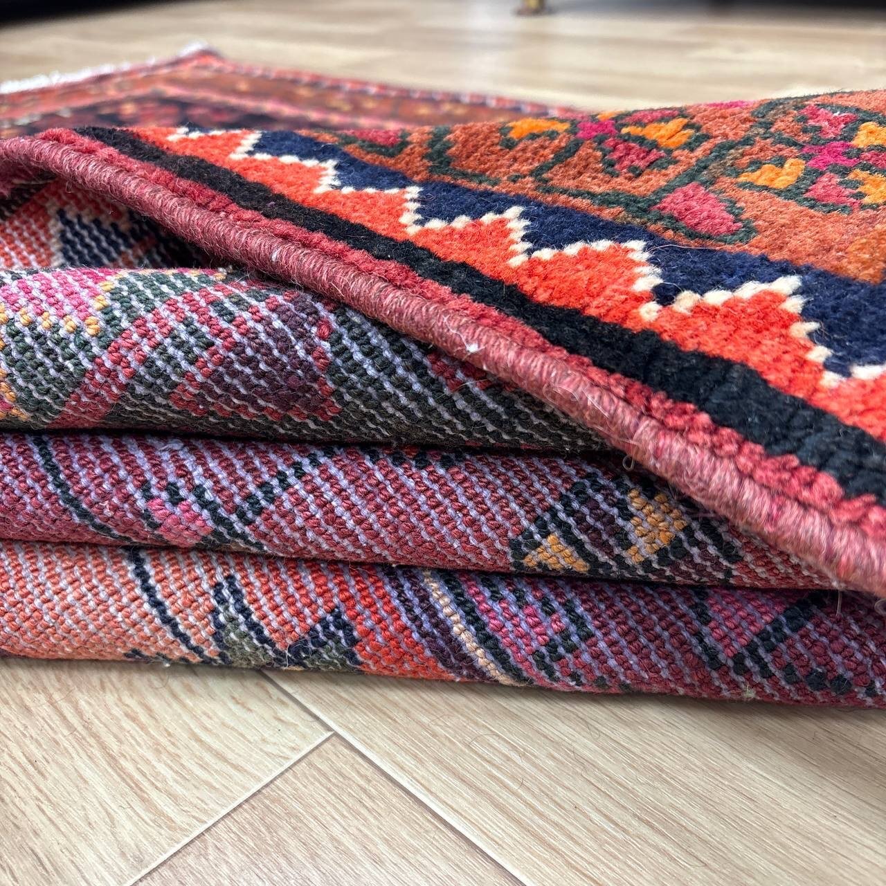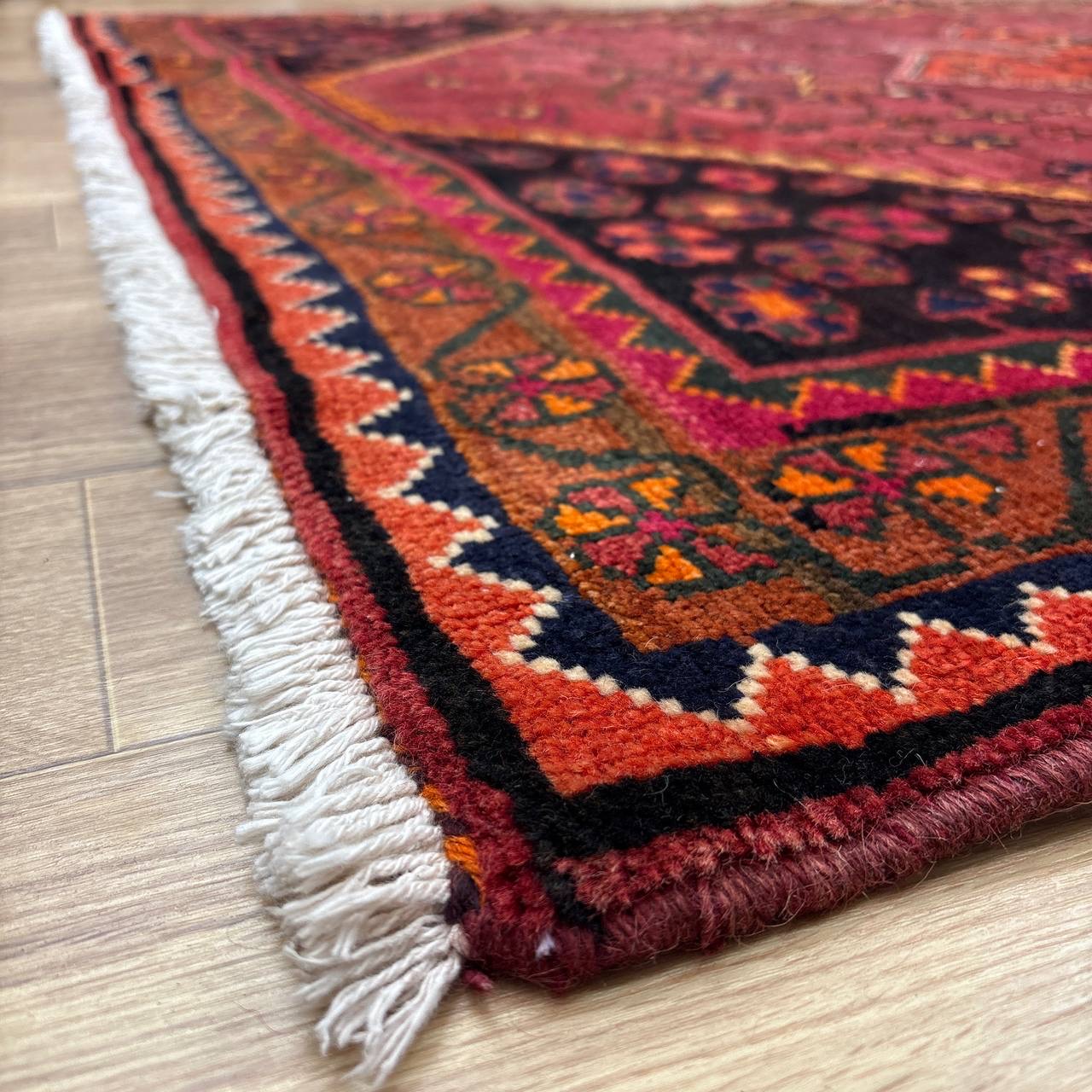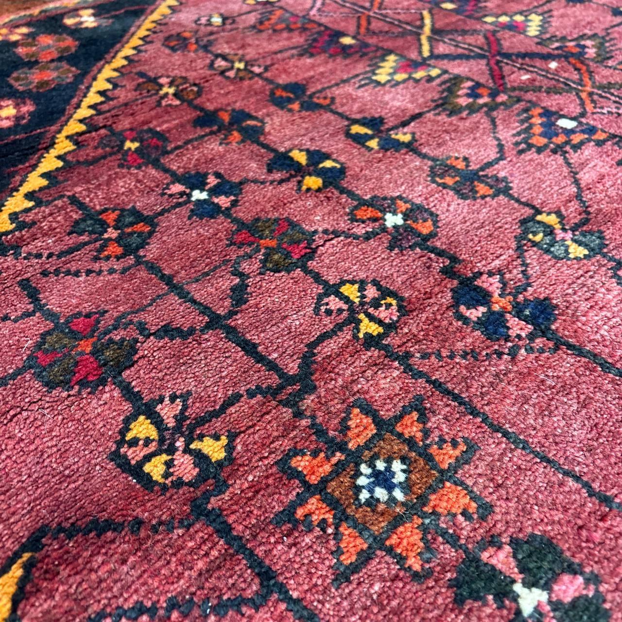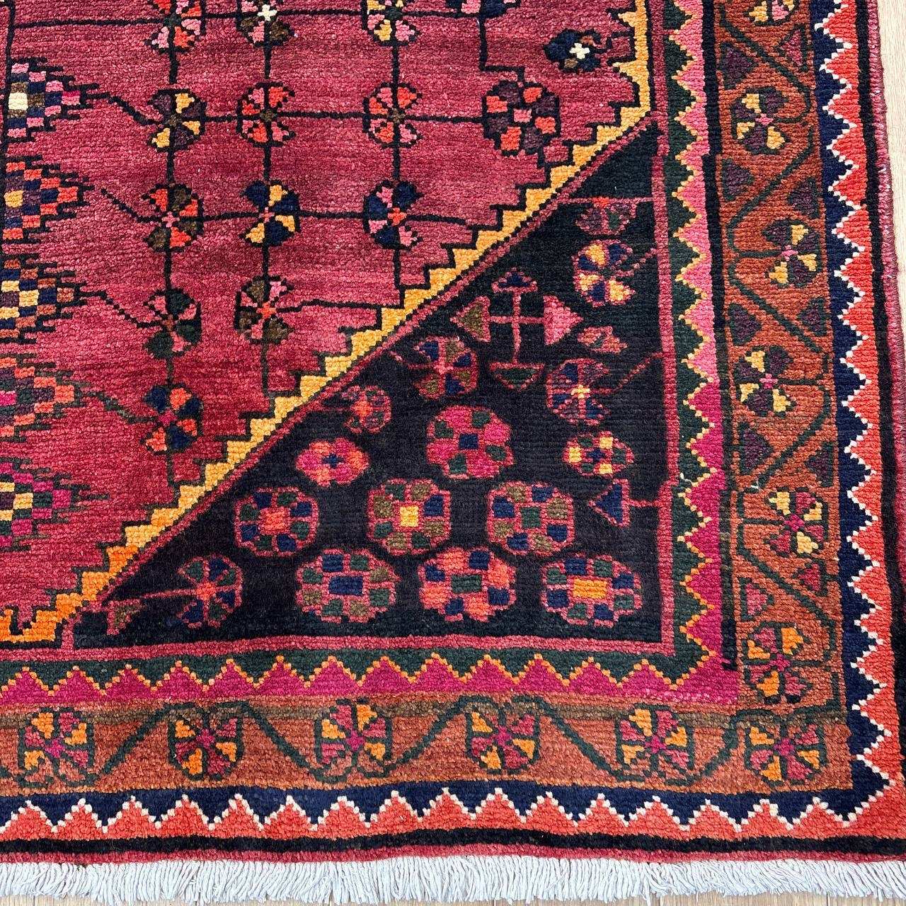 -------- 【触り心地は、、、】 面で触ると柔らかく豊富な毛足の密に詰まったコシのある弾力を感じる織り地です。 毛足に沿って撫でるとふわりとやわらかな毛足の肉感も感じることが出来ます。 ウールの経糸にしっかりとした織られた織り地にはコシのある弾力で、歩いたり、腰を下ろした際には柔らかな弾力とウールの厚みを感じさせ弾力あるやわらかな毛足の感触が床面の感触と共に伝ってきます。 柔らかな触り心地は、床面の感触と共にほのかに伝わり、ウールに包み込まれるようでとても安心感を与えてくれます。 絨毯の上で膝立ちしても床面の感触が少ない柔らかな肉感があります。 ウールパイルの1本1本がふわふわとしたきめ細かな毛足で、キメの細かい織にウールの1本1本が互いを支えコシのある立ち上がりの良い毛足の状態です。 密集し、均一に立ち上がった引き締まりの良い毛足に沿ってなでるとふわふわとした柔らかな触り心地です。 暮らしの中で年月と共に深まる風合いをお楽しみください。 -------- 【状態詳細は、、、】 柔らかく良質なウールを使用して緻密な模様を織りあげられた絨毯です。 豊富な毛足が詰まった肉感があり、ウール縦糸で織られた織地はしっかりとして、柔らかな毛足を携えています。 毛足の立ち上がりもとてもよく、絨毯全体の毛足は、1本1本のやわらかな毛足がみっしりと密集して、きめ細かです。 絨毯の裏を見ると、織り込まれた編目は細かくしっかりと密に並んでいます。 約1.3cm程度の肉感ある毛足で、見た目にも柔らかな質感を感じる均一な立ち上がりの毛足です。 豊富で肉感のある毛足ですが、毛足のやや長い箇所、やや短い箇所があります。使用に問題はございません。 使用された良質なウールは、みっしりと詰まった丈夫な毛足で、これからも長く使用していけるお品です。 -------- 【サイズ感は、、、】 2〜3人掛けソファーの前やベッドサイドにオススメのサイズ感です。 ソファーの前やベッドサイドにオススメです。 ごろんと横になって身体を預けるのも気持ちが良いものです。 リビングルームや寝室、音楽部屋や趣味の空間等々マルチに活躍するサイズ感です。 棚、チェストの足元やストーブの前等アクセントに最適です。 取り回しも簡単なサイズ感なので、気分や季節で配置を変更するのも気軽です。 良いラグはあなたの空間を特別なものに変えてくれます。 -------- ***デザインについて*** ◆全体のデザイン◆ 絨毯の中央のメダリオンを配したデザインで、シラーズのヘイバトルーに似たデザインにカギ型の縁取りを持ったメダリオンが並ぶ様はヤラメ絨毯のオーソドックスな王道のデザインです。 メダリオンはトランジと呼ばれ、宇宙の中心を指しているとも言われています。 トランジの縁取りにはランニングドッグ(走る犬)柄と呼ばれる鈎型の犬の歯を模した文様が配されており、家内安全の意味合いを持っています。 抽象化された模様は犬の形を成していませんが、一般的に古代から動物のモチーフには守護の意味合いが多くみられ、外敵から生活を守るといった意味合いが伺えます。 直線的に描かれたジオメトリックなデザインのこの絨毯は、シラーズを拠点にする遊牧民であるカシュガイ族特有のデザインであるヘイバトルー柄にも似ています。 小さいメダリオンと大きなコーナーが特徴的で、フィールドやコーナーの中には細かな幾何学的な模様のメダリオンモチーフや、神様の使者とされる鳥のモチーフ、Sを横にした形の厄除けケルマック模様や、健康長寿の願いが込められた生命の樹のモチーフや、厄除けのメダリオン等のシンボルがちりばめられ、素朴でポップな印象もあります。 様々なモチーフが描かれた見ていて飽きない素敵なデザインです。 ***
