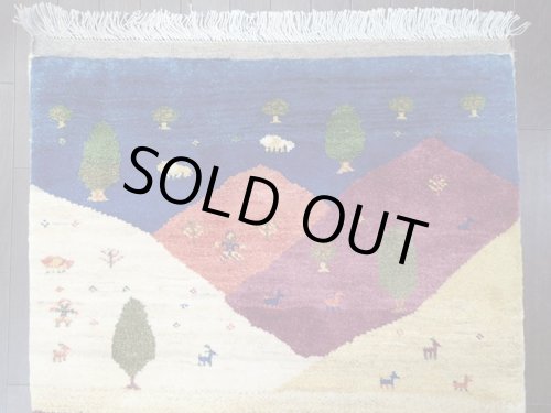 新品 ペルシャ ギャッベ 1.2m アクセント サイズ 115 x 84 cm n216 ハンドメイド ギャベ 手織り トライバル ラグ 天然 ウール 敷物 マット カーペット 赤 オレンジ 緑 カラフル ラスタカラー 木 動物 夕焼け 風景