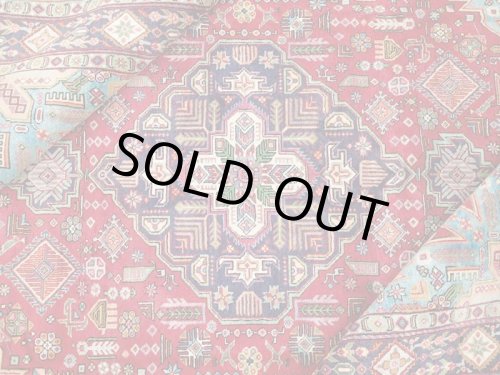 ***手触りやコンディションについて*** ふんわりと細かな毛足で、手触りはとてもやわらかでもっちりとしています。 絨毯の裏を見ると、織り込まれた編目はみっちりと正方形で密に並んでおります。 しっかりとした均一で密な織りですが、表地の毛足は毛流れに沿って落ち着いて、経年に伴う引き締まり具合を見せています。 絨毯を踏みしめた際には、ふんわりと毛足に沈み、しっかりと引き締まった中にもやわらかな毛足の感触がもっちりとした弾力と共に伝わってきます。 色合いは、経年により落ち着いた色合いを見せる鮮やかな赤が印象的で、青系の色合いは鮮やかな中にも風合いある色落ちを見せており、落ち着いた印象を与えます。 やわらかく弾力のある引き締まった毛足は、光の当たり具合によって鮮やかな色合いをより美しくその表情を変えてくれます。 30年程度の経年のお品で、毛足やセルビッチ(大外の縁取り)の大きなダメージも見受けられない状態の良いお品です。