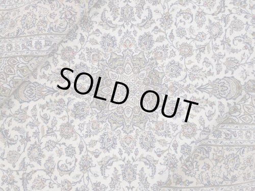 イラン・カシャーンで作られたペルシャ絨毯です。 3人掛けソファの前に敷いてお部屋をくつろぎの空間に。。。 イランの5大絨毯産地の一つカシャーンで、良質な羊毛を紡いで丁寧に織り上げた美品の手織りペルシャ絨毯です。 職人気質なカシャーンならではの高品質な織り地で、伝統的なアラベスク模様を織り込んだ美しいデザインです。 経年20年程度のビンテージのお品で、使用が少なく経年を感じさせない毛足の立ち上がりを見せる柔らかな毛足をはじめ、全体的な状態が非常に良い美品です。 344×248cmのサイズ感は6帖程度のサイズで、リビングルーム等の2〜3人掛けのソファの足元に敷くのに最適です。 ***デザインやカラーリングについて*** ◆全体のデザイン◆ クム、イスファハーン、ナイン、タブリーズと並ぶペルシャ絨毯の5大生産地として知られてるカシャーン産の絨毯は、全体に所狭しとアラベスク模様の花々が美しく咲き乱れるデザインが主流です。 こちらの絨毯は中央にメダリオンを配した『トランジ』デザインで花や樹木を扱った花柄の『ヘリス』デザインです。 ◆全体のカラーリング◆ 生成りがかった白、淡いグレーとピンク色のカラーリングが全体のベースとなっています。 縁取り等を濃紺の色合いや茶や抹茶色がかった緑の濃淡で表現しており落ち着きが与えられます。 柔らかな色合いの印象を与えてくれる美しい絨毯です。 ◆各部位の説明◆ ◇トランジメダリオン◇ 絨毯の中心には宇宙の中心を意味すると言われる『トランジ』と呼ばれる中央のメダリオンが配されています。 トランジの中心には花の模様が配され、トランジの外へ花々が飛び出すようにデザインされ非常に美しい印象を与えます。 中心のトランジは淡い水色やピンクを使用し、さらに外側のトランジメダリオンはグレーで織られ、花々は紺やグリーン、グレーやピンクの縁取りでデザインされ柔らかな印象を与えます。 ◇フィールド◇ 絨毯中央の大部分を占めるフィールドは生成りがかった白をベースとしており柔らかで落ち着いた印象です。 全体的に使用する色合いが淡い色合いの為、やさしくやわらかな印象を与えます。 中央のトランジメダリオンをアラベスク模様の柔らかな印象で描かれた花々や草木が所狭しと漂い囲むように描かれています。 よく見ていくと草木のデザインや配列、そして色合いには計算された規則性を感じ、細かくちりばめられた花の模様にもまとまりを感じます。 ◇コーナーラチャキトランジメダリオン◇ 四隅に配されたメダリオンの『ラチャキ』は、中央のトランジと同様にピンク、水色、灰色が使用されています。 優しい色合いの中に、ラチャキの縁取りにも紺やグレー、緑を使用することでデザインが引き締まり美しく見えます。 ◇外枠ボーダー◇ 外枠の太いボーダーはグレーをベースカラーとしており大きくデザインされた花々が配されています。 中央のボーダー(灰)を細いボーダー(白)と極細のボーダー(水色)枠が挟み込んでいます。 ボーダーラインにはそれぞれ中に細かくデフォルメされた花の模様がちりばめられ、大小の花々が、フィールドとはまた違ったテイストで描かれており、全体の印象を美しくまとめてくれています。 デザイン・配色に統一性があり、咲き乱れる花々のデザインは美しく華やかなだけでなく、淡い色合いを基調とした色合いでやわらかで落ち着いた印象を与えます。 ***手触りやコンディションについて*** ◆全体のコンディション◆ 20年程度の経年のお品ですが、約0.8cm程度の毛足は肉厚でやわらかくきめ細かで、経年を感じさせない毛足の立ち上がりです。 立ち上がりの良い柔らかな毛足にグレーやピンクをはじめ淡い色合いを使用したパイルが優しく落ち着いた印象を与えてくれます。 毛足やセルビッチ(大外の縁取り)の大きなダメージも見受けられず、経年を感じさせない上品な印象を与える非常に状態の良い美品と言えるお品です。 ◆手触り◆ 手触りはとてもやわらかでふんわりとしており、肉厚な毛足です。 絨毯を踏みしめた際には、床面の感触と共にふんわりと包まれるような肉厚で弾力あるやわらかな毛足の感触が伝わってきます。 やわらかくも引き締まった毛足は、光の当たり具合によって淡い色合いをより美しくその表情を変えてくれます。 暮らしの中で年月と共に深まる風合いをお楽しみください。 *** ペルシャ絨毯には毛の流れがあり、一方向に羊毛が若干”ねている”様になっています。 大きなサイズのペルシャ絨毯になりますと、毛の流れに光が反射して、光の当たる方向によって、見え方も若干変化してまいります。 日光と共に表情を変える天然ウールの絨毯の毛並みを楽しめるのも大きなサイズならではです。 *** リビングルームの中心に、2〜3人掛けのカウチソファーの前に敷いて、テーブルも置くことのできるサイズです。 ダイニングルームでテーブル下に敷いて、食卓を明るくしてくれます。 ペルシャ絨毯の緻