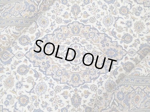 ***デザインやカラーリングについて*** 生成り色がかった白、濃紺、エンジがかった茶色をベースカラーとした色合いの絨毯です。 それぞれのパートに細かなマヒ模様をあしらっており、ピンク、茶、紺、白、緑、黄、赤、グレー、水色等の様々なカラフルな色合いを使用して細かく高密度に織り込まれています。細かく織られたマヒ模様の花の中心部分は光沢の良い白いシルク糸が使用されております。 伝統的なデザインで王道を感じさせます。