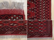 ***デザインやカラーリングについて*** ◆全体のデザイン◆ こちらの絨毯は一つの模様を絨毯全体に規則的に並べた総柄のオーバーオールデザインです。 一つの模様を絨毯全体に規則的に並べた総柄のデザインです。 『ギュル(ゴル)』と呼ばれる幾何学的なトルクメン族の家紋模様が配されています。 ◆全体のカラーリング◆ トルクメン絨毯の代名詞ともいえる赤の色合いをベースカラーにした配色です。 エンジを思わせる深みのあるまろやかな赤で、はっきりとした赤というよりもやや茶の混ざった落ち着いた色合いの印象です。 新品ならではのみっしりと詰まった織りにもちもちとした手触りの毛足が、ギュルの模様と色合いをより味わい深い印象としてくれています。 やわらかで味わい深い毛足の流れに日差しが当たることや、見る向きや角度によって見え方がまろやかな茶色がかった赤から深みあるエンジ色へと美しく変わります。 日差し、影、部屋の電気、間接照明など、朝、昼、夜で違った顔を見せてくれるところも素晴らしいところです。 ◆各部位の説明◆ ◇フィールド◇ ギュルと呼ばれる特徴的な家紋がラグのフィールド一杯にデザインされた幾何学的で美しいデザインです。 柔らかな毛足の赤の織り地にギュルが連続しています。 シンプルなデザインがとても良くマッチしています。