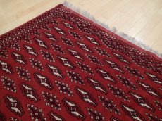 イラン・トルクメン族の部族絨毯(トライバルラグ)です。 新品未使用のお品です。 トルクメン絨毯ならではの深みのある赤をベースカラーに、規則性のあるギュルの幾何学模様が非常に美しいデザインの1枚です。 ギュル(ゴル)という象の足とも呼ばれる特徴的な家紋をモチーフにしており、緻密に織られた幾何学模様が特徴です。 照明や日差し、見る角度によって、発色の良い赤から深く落ち着いたエンジの色合いに表情を変えてくれます。