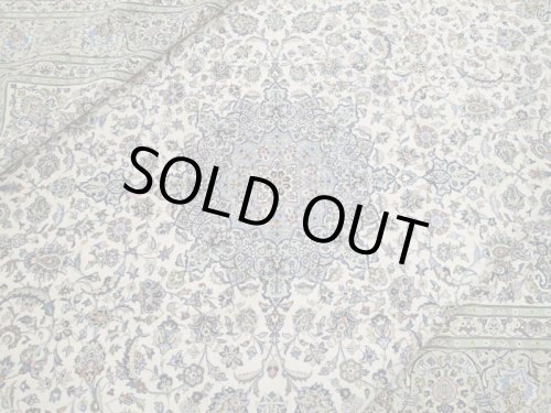 経年20年程度のヴィンテージ品です。 淡く優しい色合いで織られた毛足の状態も良好で、中古品に抵抗のあるかたにもおすすめです。 とても肉厚な絨毯で、毛足は1本1本がふわりとしていて、面で触るとふかふかとして気持ちが良く、持ち上げるとくにゃりとする非常に柔らかな感触です。 均一な毛足の立ち上がりを見せるウールパイルです。 淡い色合いの毛足は経年によりクリーミーでまろやかな美しい風合いを増しています。 全体の色合いは色ムラ感を感じない均一さです。 毛足の流れの影響で、見る角度によって印象を変化させる美しい絨毯です。 白っぽく輝く様な色合いから、エメラルドグリーンを経て、深く落ち着いた色合いに表情を変化させてくれます。 色合い、状態共に良好な状態の毛足で、イラン本国でクリーニングメンテナンスが施された美品と言える絨毯です。