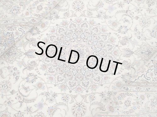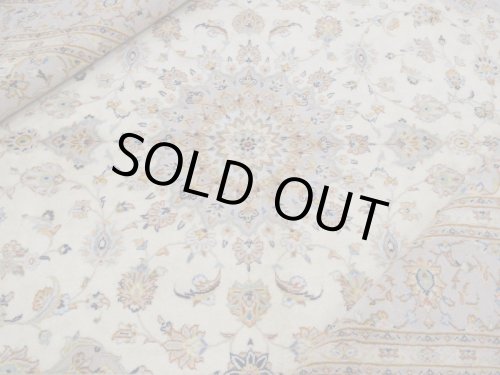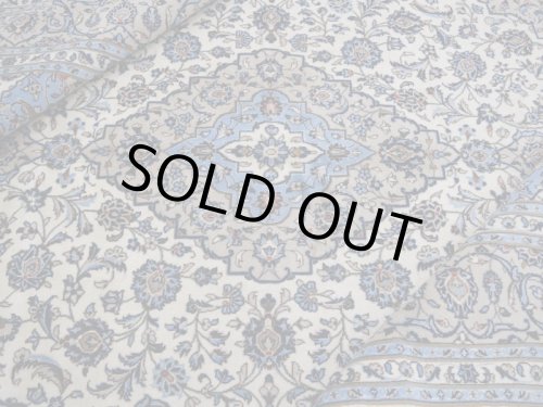約6.2㎡・6帖程度のサイズで、リビングルーム等の2〜3人掛けのソファの足元に敷くのに最適です。 ***デザインやカラーリングについて*** ◆全体のデザイン◆ クム、イスファハーン、ナイン、タブリーズと並ぶペルシャ絨毯の5大生産地として知られているカシャーン産の絨毯は、全体に所狭しとアラベスク模様の花々が美しく咲き乱れるデザインが主流です。 こちらの絨毯は中央にメダリオンを配した『トランジ』デザインです。 中央にメダリオンをフィールドの四隅にコーナーメダリオンを配していることから『メダリオンコーナー』デザインとも呼ばれます。 バラやユリの断面をデザインしたシャーアッバス模様をあしらった、花や樹木を扱った花柄のアラベスク調の王道デザインです。 職人気質で、伝統的なデザインを重んじるカシャーンならではの花柄の模様が美しい王道の落ち着いたデザインです。 全体の優しい色合いと調和した美しいデザインが魅力的です。 ◆全体のカラーリング◆ メダリオンやボーダーに使用された淡い茶色がかったグレーベージュの色合いとフィールドに使用されたまろやかでクリーミーな生成り色等の優しく落ち着いた色合いが絨毯全体のベースカラーになっています。 グレーや水色、エメラルドグリーン等の淡い色合いを差し色として使用し、絨毯をより優しい印象にしてくれています。 花々や草木の模様の輪郭や縁取りの箇所箇所に茶やネイビー等のはっきりとした色合いも使用しています。 毛足の流れ方向にぺたりと寝たふわりと柔らかな毛足に日差しが当たることや角度によって見え方が美しく変わります。 白っぽく反射するような色合いから、クリーミーで深く落ち着いたまろみある色合いへと表情を変化させてくれます。 日差し、影、部屋の電気、間接照明など、朝、昼、夜で違った顔を見せてくれるところも素晴らしいところです。