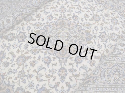 約5.8㎡・6帖程度のサイズで、リビングルーム等の2〜3人掛けのソファの足元に敷くのに最適です。 ***デザインやカラーリングについて*** ◆全体のデザイン◆ クム、イスファハーン、ナイン、タブリーズと並ぶペルシャ絨毯の5大生産地として知られているカシャーン産の絨毯は、全体に所狭しとアラベスク模様の花々が美しく咲き乱れるデザインが主流です。 こちらの絨毯は中央にメダリオンを配した『トランジ』デザインです。 中央にメダリオンをフィールドの四隅にコーナーメダリオンを配していることから『メダリオンコーナー』デザインとも呼ばれます。 バラやユリの断面をデザインしたシャーアッバス模様をあしらった、花や樹木を扱った花柄のアラベスク調の王道デザインです。 職人気質で、伝統的なデザインを重んじるカシャーンならではの花柄の模様が美しい王道の落ち着いたデザインです。 全体の優しい色合いと調和した美しいデザインが魅力的です。 ◆全体のカラーリング◆ メダリオンに使用された淡い茶色がかったベージュの色合いとフィールドに使用されたまろやかでクリーミーな生成り色、ボーダーに配されて絨毯を囲むピンクが絨毯全体のベースカラーになっています。 ふかふかと柔らかな毛足の印象と相俟ってベースとなる優しい色合いがまろやかに映し出されます。 紺色や水色の青系の濃淡、グレーやピンク、オレンジやイエロー等の淡い色合いを差し色として使用し、肉厚でやわらかな絨毯をより優しい印象にしてくれています。 また、花模様等に黄の色合いを多用し、フィールドのクリーム色やベージュとの相乗効果によりゴールドの様な色合いの印象を与えます。 花々や草木の模様の輪郭や縁取りの箇所箇所に茶やネイビー等のはっきりとした色合いも使用しています。 肉厚でふわりと柔らかな毛足に日差しが当たることや角度によって見え方が美しく変わります。 白っぽく反射するような色合いから、クリーミーで深く落ち着いたまろみある色合いへと表情を変化させてくれます。 日差し、影、部屋の電気、間接照明など、朝、昼、夜で違った顔を見せてくれるところも素晴らしいところです。