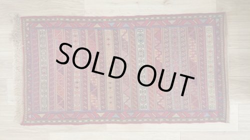 *** キリムとは、主にウールの平織りの織物を指し、絨毯(じゅうたん)・ギャッベの様な毛足はなく、薄く平たい織物です。 幾何学模様のモチーフは様々な意味を持ち、その独創的な色・デザインの持つ高い芸術性は世界的に注目されています。 トルコの遊牧民が古くから使用してきたものが有名ですが、敷物・織物が有名なイランでも遊牧民の間で使用されてきました。 敷物に限らずテント布や収納用具などの生活道具として使われていましたが、19世紀の末ごろから欧米の人々が好んで買い求めるようになり、平織りの敷物の総称としてキリムと呼ぶようになっています。 *** 暮らしの中で年月と共に深まる風合いをお楽しみください。 ギャッベと同じく、キリムもオーガニック由来の染料を用いて染め上げられた羊毛を、縦糸にひとつひとつ毛足を結びつけて織り上げていきます。 自然由来のオーガニックな原料との調合や配合によって色の濃淡を作り上げ、それを羊毛(ウール)に染色することで深みのある色合いを染め上げています。 天然自然由来の製法で染色された羊毛は肌にも優しく安心です。 ウールを紡ぐところから、全体を洗う作業まで全て手作業で行われています。 垂直に縦糸をぴんと張った織り機に、横糸を通して目を詰めていきます。 色を切り替えるときは、横糸を折り返してゆき、幾何学模様を織り込んでいきます。 *** キリムを織る技法や道具は、地域によって(トルコ・中央アジア・イラン(ペルシャ))それぞれ違った特性が見られます。 また、豊富な色彩と力強い幾何学模様を持ち、特にオールドキリムは産地ごとの独自性が保たれ、デザインにそれぞれ違った特性が見られます。 平織りのほかに、飾り糸を織り込んでより複雑で頑丈な織りをつくる、ジジム(Cicim)やスマック(Sumak)、ジリ(Gili)など、さまざまな技法が用いられます。 全てを総称してキリムとして扱われます。 *** 羊毛は呼吸しています。 見た目はふかふかですが、寒暖の差が激しいイランに暮らす遊牧民が昔から織って使ってきた敷物ですので、夏でも快適に過ごせます。 ぽってりとした厚みのわりに通気性があり、床暖房やホットカーペットの上に敷いても、ほんわかと心地よい暖かさが伝わってきます。 | | サイズ | 縦100cm × 横52cm | | 手触り | ソフト、持ち上げるとくにゃりとする織り地、表地はややざらざらとした手触り、 | | 素材 | ウール | | 原産地 | イラン・グーチャン | | 状態 | 【NEW】新品未使用品 ペルシャ絨毯の本場イランでより直輸入しております。 ハンドメイドの商品ですので、多少のゆがみや大きさの違い、毛羽立ちや色ムラなどはご理解いただきます様お願いします。 ご利用のモニター環境によって色合いや見え方は異なります。ご了承下さいませ。 | | 備考 | ラグを保管・発送する際は、折り畳まれた状態、若しくはロール状態とさせていただいております。 折り畳まれた状態の場合、ラグにシワがつく場合がございます。 また、ロール状態の場合は丸まった状態のクセがつく場合がございます。 ラグを敷いて1週間〜2週間ほどでシワ・クセは取れてまいります。 ※季節・商品の状態により期間は異なります。 | | お手入れについて | ★普段のお手入れは、丁寧に掃除機をかけてホコリをとって下さい。 また、時々は絨毯を敷いている床面もお掃除してください。★敷物は素材や製法を問わず、高温多湿を嫌います。晴天の日にはお部屋に充分風を通してください。 ウール製品は湿気に弱いので乾燥を保つようお願いします。 月一回程度陰干しをして乾燥させ、日光に当てて干し、外に出して裏からはたいてホコリを出し、時々四隅をめくって風を通してください。 羊毛独特の匂いがでる場合がございます。その際はよく晴れた日に表面裏面を風通しの良い場所でよく干して下さい。 直接加湿器の当たる場所、結露などのある場所でのご使用は避けてください。 ★家具同様に敷物にとっても日焼けの恐れのある直射日光はなるべくお避け下さい。 ★家具の脚が絨毯にかかる場合は、脚底にフェルトなどを当ててください。 時折配置する場所を変えたり、絨毯の方向を変えてお使いください。 ★水等をこぼした際は、速やかに乾いたタオル等で叩くように吸い取ってください。 色の滲みを防ぐため擦らないでください。 ★部分的に汚れた場合、速やかに乾いた布に薄めた中性洗剤(ウール洗剤)を含ませ、水分を切ったうえで、絨毯表面の汚れを叩くように取り除いてください。 汚れが取れない場合は、無理をせずメンテナンスの専門家にお任せ下さい。 | | 配送について | こちらのお品は【クロネコヤマト宅急便 80サイズ予定】での配送予定となります。 ※サイズは配送時に変更となる事もございます。ご了承下さいませ。 |