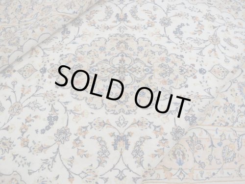 【見た目に、、、】 見た目にも柔らかなウールがやや毛流れの方向に寝ています。 そのことで、見る方向による毛足の見え方の違い、印象の違いが強い絨毯です。 クリーミーな色合いから光の反射する艶めいた白っぽい色合いへの変化が日常をより明るい印象に変えてくれます。 1本1本がふわふわとした柔らかな毛足はきめ細かで均一な立ち上がりに整っています。 みっしりと詰まった毛足はセンターテーブル等を置いても非常に安定するしっかりとした織り地です。 毛足がやや毛流れに沿って寝て経年の良い引き締まりを感じさせます。 近めにはマットな見た目、遠目にツヤ感の感じる毛足で、角度によってクリーミーな色合いから光が反射して輝くような色合いへと印象を変えます。 -------- 【触り心地は、、、】 薄手な絨毯ですが、面で触るとふわふわと密集した毛足の肉感を感じる織り地です。 1本1本がふわふわとしたきめ細かな毛足で包み込むような優しい感触を感じます。 持ち上げるとくにゃりとする織り地ですが、職人の街カシャーンで織りあげられた簡単に捲れることのないしっかりとしたベースの織り地です。 薄手ながらもみっしりと詰まった肉感を感じ、ふわふわとした毛足の肉感を感じます。 柔らかな肉感と共に床面の感触が身体に伝わり、包み込まれるような安心感ある優しい感触を味わえます。 毛の流れに沿って寝た引き締まりの良い毛足に沿ってなでるとさらりと柔らかな触り心地です。 -------- 【詳細は、、、】 柔らかく良質なウールを使用して織りあげられた絨毯です。 ウールの表地は非常にやわらかく滑らかで、パイルをなでると、さらりと包まれるような柔らかさです。 経年20年〜程度のヴィンテージのお品ですが、状態の良い毛足で均一な毛足で色合いの美しさが際立ちます。 絨毯全体の毛足は、1本1本のやわらかな毛足がみっしりと密集して、表面がきめ細かです。 約0.8cm程度の毛足は薄手で毛足も短めですが、均一な立ち上がりの毛足で、見た目にも肉感があります。 柔らかな美品状態の毛足でスレ等ダメージはなく、美しい色合いやふわふわとした柔らかなウールの良質さが際立ち、絨毯全体の印象を優しいものにしています。 -------- 【状態は、、、】 中古品に抵抗がある方にもお勧めできる美品状態です。 経年20年〜程度の年代物ですが、良質な毛足に緻密に織られた織り地は美しい状態で手触り・色合い共に美しい状態です。 大きなダメージも無く、全体的な毛足の状態が良い美品と言えるヴィンテージ品で、本場イランでのクリーニングを経て気持ちよくお使いいただけます。 フリンジも新品の様にメンテナンスがなされ気持ちよくお使いいただけます。 -------- 【サイズ感は、、、】 約5.8㎡・6帖程度のサイズ感で、大判の絨毯はリビング・ダイニングルームや客室の中心に、3人掛けやコーナーソファの足元に敷いてお部屋をくつろぎの空間に変えてくれます。。。 ホテルや旅館、ペンション等の人の集まる場所にも最適な大きなサイズと上品な美しさです。 大きなサイズはホテルや旅館、ペンション等のお客様をおもてなしする場にも相応しい大きなサイズと良質な毛足、上品な美しさを兼ね備えた1枚です。 良いラグはあなたの空間を特別なものに変えてくれます。 -------- ***デザインやカラーリングについて*** ◆全体のデザイン◆ クム、イスファハーン、ナイン、タブリーズと並ぶペルシャ絨毯の5大生産地として知られているカシャーン産の絨毯は、全体に所狭しとアラベスク模様の花々が美しく咲き乱れるデザインが主流です。 こちらの絨毯は中央にメダリオンを配した『トランジ』デザインです。 中央にメダリオンをフィールドの四隅にコーナーメダリオンを配していることから『メダリオンコーナー』デザインとも呼ばれます。 バラやユリの断面をデザインしたシャーアッバス模様をあしらった、花や樹木を扱った花柄のアラベスク調の王道デザインです。 職人気質で、伝統的なデザインを重んじるカシャーンならではの花柄の模様が美しい王道の落ち着いたデザインです。 全体の優しい色合いと調和した美しいデザインが魅力的です。 王道デザインを好むカシャーン産の絨毯では、絨毯の中央に大きなメダリオンを配する古くから伝わるクラシックな王道デザインが一般的です。 ユリやダリヤの断面を描いたシャーアッバス模様の花々がきめ細かな毛足に美しく描かれています。
