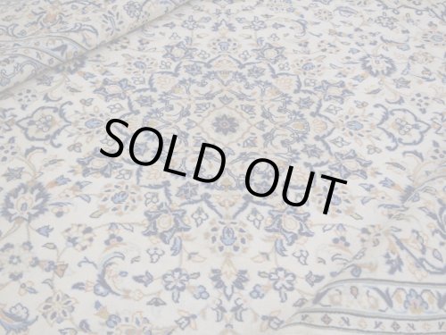 【見た目に、、、】 見た目にも肉厚な絨毯です。 絨毯のフィールドは見た目にも柔らかで良質なウールが使用され、クリーミーな色合いが優しい印象を与えます。 1本1本がふわふわとした柔らかな毛足はきめ細かで、ふわふわとした印象の立ち上がり良い毛足はセンターテーブル等を置いても非常に安定するしっかりとした織り地です。 近めにはマットな見た目、遠目にツヤ感の感じる毛足で、角度によってクリーミーな色合いから光が反射して輝くような色合いへと印象を変えます。 -------- 【触り心地は、、、】 面で触るともちもちとした低反発感ある弾力を感じる織り地です。 ふかふかとした触り心地はウールに包み込まれるようでとても安心感を与えてくれます。 1本1本がふわふわとしたきめ細かな毛足で立ち上がりの良い毛足の状態です。 簡単に捲れることのないしっかりとしたベースの織り地です。 みっしりと詰まった肉感を感じ、ふわふわとした毛足の肉感を感じます。 面でさわるとふわふわとした毛足の密集した肉感を感じる触り心地です。 柔らかな肉感と共に床面の感触が身体に伝わり、包み込まれるような安心感ある優しい感触を味わえます。 毛の流れに沿って寝た引き締まりの良い毛足に沿ってなでるとふわふわとした柔らかな触り心地です。 -------- 【詳細は、、、】 柔らかく良質なウールを使用して織りあげられた絨毯です。 経年20年〜程度のヴィンテージのお品ですが、状態の良い毛足で均一な毛足の立ち上がりもよく白っぽい生成りの色合いとブルー系の色合いのコントラストの色合いの美しさが際立ちます。 絨毯全体の毛足は、1本1本のやわらかな毛足がみっしりと密集して、きめ細かです。 約1.0cm程度の毛足は見た目にも肉厚で均一な立ち上がりの毛足です。 柔らかな美品状態の毛足で大きなスレ等ダメージはなく、美しい色合いやふわふわとした柔らかなウールの良質さが際立ち、絨毯全体の印象を優しいものにしています。 -------- 【状態は、、、】 中古品に抵抗がある方にもお勧めできる美品状態です。 経年20年〜程度の年代物ですが、良質な毛足に緻密に織られた織り地は美しい状態で手触り・色合い共に美しい状態です。 大きなダメージも無く、全体的な毛足の状態が良い美品と言えるヴィンテージ品で、本場イランでのクリーニングを経て気持ちよくお使いいただけます。 遠目に見るとわからない程度の1cm程度のリペアが数箇所ございますが、使用に問題ございません。 フリンジも新品の様にメンテナンスがなされ気持ちよくお使いいただけます。 -------- 【サイズ感は、、、】 約8.8㎡・6帖程度のサイズ感で、大判の絨毯はリビング・ダイニングルームや客室の中心に、3人掛けやコーナーソファの足元に敷いてお部屋をくつろぎの空間に変えてくれます。。。 ホテルや旅館、ペンション等の人の集まる場所にも最適な大きなサイズと上品な美しさです。 大きなサイズはホテルや旅館、ペンション等のお客様をおもてなしする場にも相応しい大きなサイズと良質な毛足、上品な美しさを兼ね備えた1枚です。 良いラグはあなたの空間を特別なものに変えてくれます。 -------- ***デザインやカラーリングについて*** ◆全体のデザイン◆ クム、イスファハーン、ナイン、タブリーズと並ぶペルシャ絨毯の5大生産地として知られているカシャーン産の絨毯は、全体に所狭しとアラベスク模様の花々が美しく咲き乱れるデザインが主流です。 こちらの絨毯は中央にメダリオンを配した『トランジ』デザインです。 中央にメダリオンをフィールドの四隅にコーナーメダリオンを配していることから『メダリオンコーナー』デザインとも呼ばれます。 バラやユリの断面をデザインしたシャーアッバス模様をあしらった、花や樹木を扱った花柄のアラベスク調の王道デザインです。 職人気質で、伝統的なデザインを重んじるカシャーンならではの花柄の模様が美しい王道の落ち着いたデザインです。 全体の優しい色合いと調和した美しいデザインが魅力的です。 王道デザインを好むカシャーン産の絨毯では、絨毯の中央に大きなメダリオンを配する古くから伝わるクラシックな王道デザインが一般的です。 ユリやダリヤの断面を描いたシャーアッバス模様の花々がきめ細かな毛足に美しく描かれています。