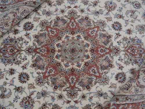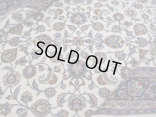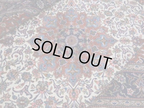 【詳細は、、、】 新品未使用のウール・シルク糸を使用した絨毯です。 密に織られた肉厚な毛足の立ち上がりもよく美しさが際立ちます。 王道のデザインに全体のクリーミーな色合いが非常に美しく上品です。 絨毯全体の毛足は、1本1本のやわらかな毛足がみっしりと密集してきめ細かで、緻密な織のデザインを際立たせています。 約1.3cm程度の毛足はみっしりと詰まって立ち上がり、見た目にもやわらかで肉感があります。 美しい色合いやふわふわとした柔らかなウールの良質さが際立ちます。