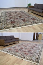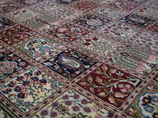 ***デザインやカラーリングについて*** ◆全体のデザイン◆ ベースとなっているのは絨毯の全体には、日干しレンガを意味する『へシティ』模様と言われるパネル意匠のデザインがされています。 『ヘシティ』模様は、ペルシャ語で日干しレンガの意味で、四角く並んだ模様がレンガを積み重ねた様に見えるデザインの為、こう呼ばれます。 もともと、水路や小道で区切られた庭園の風景を表現しています。 イランではとても乾燥しているため、豊かな緑と水への憧れを絨毯の中で表している様に感じさせます。 パネル状に配されたヘシティ柄には様々な草木やボテ模様(ペイズリー柄の原型)やゴルダニ(花瓶模様)が配されており、ピンク、茶、紺、白、エメラルドグリーン、緑、抹茶、オリーブ、黄、赤、グレー、紺、水色等の様々なカラフルな色合いを使用して細かく高密度に織り込まれています。 伝統的なデザインは王道を感じさせ、明るさだけでなく落ち着いた印象も与えてくれます。 それぞれのブロックに分けられたパネル模様のデザインの中には、シルク糸が配されいるものもあり模様の美しさを際立たせています。 良質な毛足で織られた模様の緻密さ、全体の優しい色合いが美しいデザインをより魅力的なものに際立たせます。 --------