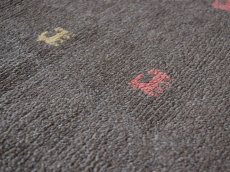 ----- 【見た目に、、、】 みっしりと詰まった分厚い毛足が立ち上がり、見た目にも肉厚です。 ふかふかとやわらかなウールの毛足は、その肉厚感から見た目にも柔らかそうに見える印象です。 ギャベならではのふかふかとした柔らかな毛足が毛流れ方向にやや傾く様に並び肉感を感じます。 グレーのウール毛足にやや茶の濃淡のある毛足がベースカラーとなっています。 ハンドメイドの味わい深いムラ感のあるグラデーションの様な色合いになっています。 ギャベを縁取るようなシンプルなデザインにカラフルなモチーフが並ぶ素敵なデザインです。 近めに見るとマットな質感を感じる毛足です。