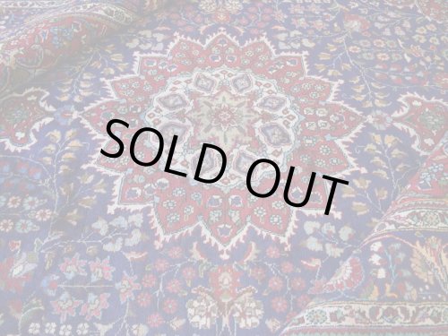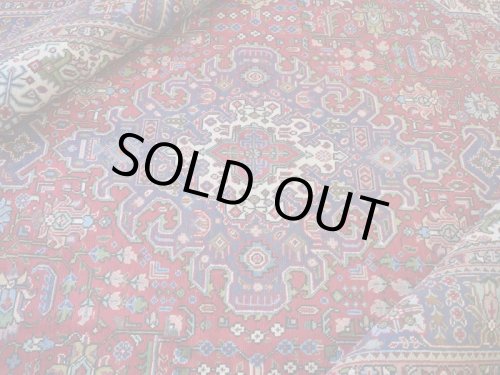 【状態は、、、】 タブリーズの良質なウールを使用して織りあげられた絨毯です。 経年〜30年程度のビンテージ品ですが、状態の良い毛足です。 主にフィールドのブルーやグリーンの毛足表面にムラ感ある経年の色合い変化が見られますが、美しい味わいとして感じられ、それにより毛足がくたびれてダメージとなっている様な印象は与えません。 絨毯の色合いや模様を一層美しい印象として引き立てています。 毛足やセルビッチ(大外の縁取り)の大きなダメージも見受けられず、状態の良いGOODコンディションのお品です。 全体的な状態が良いGOODコンディションのヴィンテージ品で、大きなスレ等のダメージもなく、本場イランでのクリーニングを経て気持ちよくお使いいただけます。 -------- 【サイズ感は、、、】 約6㎡・〜6帖程度のサイズ感で、大判の絨毯はリビング・ダイニングルームや客室の中心に、3人掛けソファやコーナーソファの足元に敷いてお部屋をくつろぎの空間に変えてくれます。。。 ホテルや旅館、ペンション等の人の集まる場所にも最適な大きなサイズと上品な美しさです。 大きなサイズはホテルや旅館、ペンション等のお客様をおもてなしする場にも相応しい大きなサイズと良質な毛足、上品な美しさを兼ね備えた1枚です。 良いラグはあなたの空間を特別なものに変えてくれます。 -------- ***デザインやカラーリングについて*** ◆全体のデザイン◆ こちらの絨毯は中央にメダリオンを配した『トランジ』デザインです。 中央にメダリオンをフィールドの四隅にコーナーメダリオンを配していることから『メダリオンコーナー』デザインとも呼ばれます。 高い絨毯製作の技術を持つタブリーズでは実に様々なデザインが織られます。 こちらのデザインは中央にダイナミックにメダリオンを配し、四隅のラチャキトランジがフィールドを囲むように配された美しいデザインです。 力強い縁取りと活き活きと描かれた花々のカラフルな色合いが生命力にあふれています。 全体に細かな模様が配されていますが、配色の統一、デザインのバランスが落ち着きを与えてくれる王道のデザインと言えます。 見ていて飽きの来ない、見ていると様々な発見のある素敵な絨毯です。 ◆全体のカラーリング◆ フィールドやボーダーの大部分を占めるまろやかな赤と経年のムラ感ある色合いの変化を見せるネイビーがベースカラーとなっています。 それぞれハッキリとした色合いですが、経年による角の取れた様なまろやかな色合いで、また、やや毛羽立つような肉感あるウール毛足の影響もあり、目に痛い色ではありません。 絨毯の毛足の色合いは全体的に、経年による色合いの変化のため、クリアですがまろやかで優しい色合いの印象です。 青系の色合いを中心にムラ感のある色落ちを見せています。 経年による色ムラ感のある色合いの毛足に関しても、良好な状態の毛足です。カスレて毛足がなくなっている様な事はありません。 絨毯全体に配された花々や草木やメダリオン等の細かな装飾には生成り色や黄、ピンク、グリーン、オリーブ等の色合いが使用され、全体的にカラフルですが、統一された色合いを使用し絨毯に落ち着きを与えています。 キメ細かくふわりとした柔らかなウールにまろやかな色合いが染色され、そこに経年の色合い変化や引き締まりを見せた毛足が、やさしくクリーミーな色合いの印象を与えています。