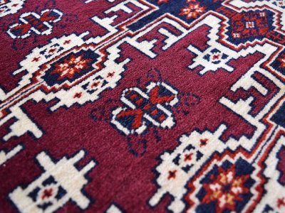 ***デザインやカラーリングについて*** ◆全体のデザイン◆ こちらの絨毯はトルクメン絨毯ならではのエンジのフィールドに幾何学模様をデザインしています。 豊穣を表す星形のモチーフや、蝶のデザインが配されています。 ◆全体のカラーリング◆ トルクメン絨毯の代名詞ともいえる赤・エンジの色合いをベースカラーにした配色です。 ワインレッドやエンジ色を感じさせる深みあるまろやかな色合いです。 近めに見るとマットな質感の毛足は、そのキメ細かさもあり、遠目に見るとツヤ感があります。 新品ならではのみっしりと詰まった織りにコシのある手触りの毛足が、幾何学的な模様と色合いをより味わい深い印象としてくれています。 やわらかで味わい深い毛足の流れに日差しが当たることや、見る向きや角度によって見え方が鮮やかで光の反射するようなワインレッドからまろやかな深みあるエンジ色へと美しく変わります。 日差し、影、部屋の電気、間接照明など、朝、昼、夜で違った顔を見せてくれるところも素晴らしいところです。 ◆各部位の説明◆ ◇フィールド◇ 幾何学的な文様がラグのフィールドにデザインされた落ち着きある美しいデザインです。 直線的に描かれたデザインの中に星形や蝶を彷彿させるモチーフがデザインされています。