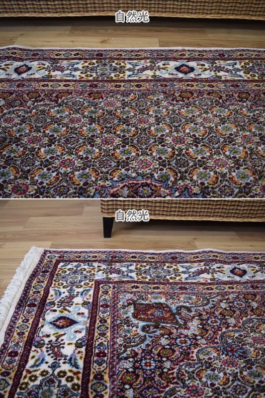 ◆全体のカラーリング◆ クリーミーで優しい印象を与える上品な色使いです。 みっしりと詰まったきめ細かな毛足が密に並び、均一な毛足の立ち上がりをしていることでデザインや色合いをとても美しく際立てています。 遠目に見ると全体のクリーミーなベースカラーの色合いが、近くに見ると緻密に織られた統一感あるカラフルな色遣いに目を奪われます。 ベースとなっているのは生成り系の色合いで、角度によってクリームから白っぽく反射するような色合いへと変化します。 メダリオンの一部等には淡い茶とネイビー、その他水色やネイビーのブルー系、マヒ模様のマヒの葉にはイエローやグリーン、花々にはピンクや赤等で描かれ、それぞれ使用された色合いに統一感があり、生命力溢れる美しさです。 見た目にも肉感ある毛足は、みっしりと立ち上がりもよくキメ細かく密に詰まっています。 キメ細かく詰まった織り地にふわふわとした手触りの毛足、まろやかな美しい色合いで、細かな文様と色合いをより味わい深い印象としてくれています。 やわらかで味わい深い毛足の流れに日差しが当たることや、見る向きや角度によって見え方が白っぽく反射する様な色合いからまろやかな深みある色合いへと美しく変わります。 毛足に流れがあることにより見え方の違いが楽しめます。 日中と夜の見え方の違いがとても面白く、昼間は日差しの反射で艶々と反射して見えるような見た目が、夜は間接照明などでより深く、落ち着いた佇まいを見せてくれます。 日差し、影、部屋の電気、間接照明など、朝、昼、夜で違った顔を見せてくれるところも素晴らしいところです。 日々の暮らしの中で美しさに対する気づきをもたらしてくれます。 ◆各部位の説明◆