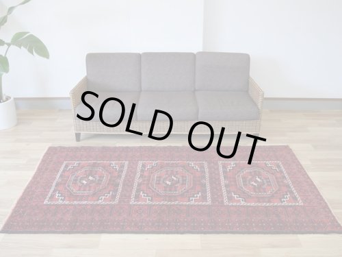 イランで作られたビンテージのバルーチ族の手織りペルシャ部族絨毯です。 バルーチならではの赤やエンジ、黒を使用した色合いと幾何学模様がとてもよくマッチしています。 やや毛羽立つ様な毛足がやわらかな、やや使用感のあるUSEDコンデションの絨毯です。 イラン本国での専門業者によるクリーニングメンテナンスを経て、日本へ輸入しております。 --------