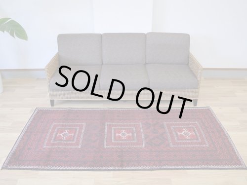 -------- 【触り心地は、、、】 面で触るとふかふかなウール毛足のもちもちとした低反発感ある弾力を感じる織り地です。 毛足に沿って撫でるとウールのふわりとした感触です。 柔らかな触り心地はギャッベにも似てウールに包み込まれるようでとても安心感を与えてくれます。 新品ならではのウールパイルの1本1本がふわふわとしたきめ細かな毛足で立ち上がりの良い毛足の状態です。 持ち上げるとくにゃりとする柔らかな織り地に1本1本が柔らかな毛足を携えています。 絨毯に腰を下ろすと、柔らかな肉感が感触が身体に伝わり、包み込まれるような安心感ある優しい感触を味わえます。床面の感触は少ないです。 -------- 【状態詳細は、、、】 新品未使用・ウールを使用して織られた手織り絨毯です。 ウールパイル部分はキメ細かく立ち上がりが良く薄手ながらもふかふかとした毛足。 柔らかく良質なウールを使用して緻密な模様を織りあげられた絨毯です。 ざっくりとした織りはギャッベにも似て、ふかふかとした毛足が気持ちが良いです。 密に詰まった均一な毛足の立ち上がりもよく、深く落ち着いた色合いから白く反射する様に変化するフィールドの色合いの美しさが際立ちます。 絨毯全体の毛足は、1本1本のやわらかな毛足がみっしりと密集して、きめ細かです。 約1.0cm程度の毛足で見た目にも柔らかな肉感を感じる均一な立ち上がりの毛足です。 スレ等ダメージはなく、美しい色合いやふわふわとした柔らかなウールの良質さが際立ち、絨毯全体の印象を優しいものにしています。 -------- 【サイズ感は、、、】 約2.2㎡・〜2-3帖程度のサイズで、リビングルーム、客室等の2〜3人掛けソファやダイニングテーブルの足元、寝室のベッドサイドに敷くのに最適です。 テーブルの足元、音楽部屋や趣味の空間にもいいですね。 良いラグはあなたの空間を特別なものに変えてくれます。 -------- ***デザインやカラーリングについて*** ◆全体のデザイン◆ 一つの模様を絨毯全体に規則的に並べた総柄のオーバーオールデザインです。 絨毯中央のフィールドはひし形に葉の模様を彷彿させるメダリオンが並びます。 絨毯を囲むボーダーはベージュをベースに豊穣を願う星のモチーフがデザインされ、それを囲む様に赤地のベースにカラフルな色合いで水の流れを表す模様があしらわれています。 やわらかく均一な立ち上がりでみっしりと揃った毛足の織り地に幾何学的な模様が映えます。 緻密に描かれたボーダーが絨毯を額装する様に美しく仕上げています。 統一感ある色合いを使用して織り上げられたデザインはまとまりがあり、トゥーマッチな印象は与えません。 ◆全体のカラーリング◆ フィールドのネイビーの色合いが特徴的です。 角度や光の具合でダークネイビーからブルーへ表情を変えます。 ネイビーの色合いにフィールドに配された幾何学的なメダリオン模様が浮き上がるようです。 ダークな色合いとクリーミーな色合いのコントラストがバルーチ絨毯らしい1枚です。 キメ細かくふわりとした柔らかなウールの毛足にまろやかな色合いが染色され、やさしくクリーミーな色合いの印象を与えています。 力強い直線的なデザインは幾何学的な模様の美しさを際立たせています。 やや毛流れ方向に寝た毛足の流れに日差しが当たることや、見る向きや角度によって見え方が美しく変わります。 白っぽく反射するような色合いから、深くクリーミーな落ち着きあるまろやかな色合いへと表情を変化させてくれます。 日差し、影、部屋の電気、間接照明など、朝、昼、夜で違った顔を見せてくれるところも素晴らしいところです。 毛足の流れがあることにより、日差しや明かり、見る角度による見え方の違いが楽しめます。 淡く優しい色合いは、日中と夜の見え方の違いがとても面白く、昼間は日差しの反射で艶々と反射して見えるような見た目が、夜は間接照明などでより深く、落ち着いた佇まいを見せてくれます。 日々の暮らしの中で美しさに対する気づきをもたらしてくれます。