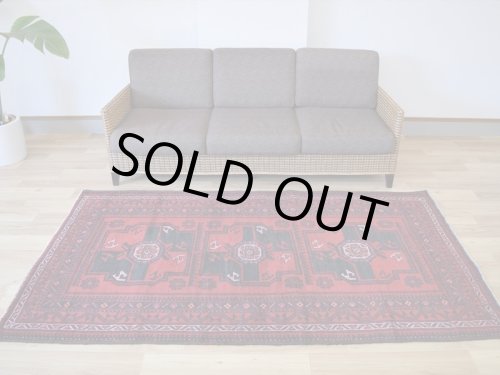 イランで作られたビンテージのバルーチ族の手織りペルシャ部族絨毯です。 バルーチならではの赤とダークな色合いのコントラストが幾何学模様がとてもよくマッチしています。 ムラ感のある色落ちを見せる風合いあるまろやかな色合い、肉感のあるやや毛羽立つ様な豊富な毛足の良品と呼べるコンディションです。 イラン本国での専門業者によるクリーニングメンテナンスを経て、日本へ輸入しております。 --------