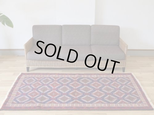 ◆全体のカラーリング◆ 全体にカラフルな配色をしていますが、ウールに染められた色合いは目に痛くないまろやかで優しい色合いの印象です。 ネイビーはややムラ感のある退色感を感じさせ経年の良い味わいを感じさせてくれます。 近めに見るとマットな質感の毛足は、そのキメ細かさもあり、遠目に見るとツヤ感があります。 みっしりと詰まった織りにやわらかな手触りの毛足が、幾何学的な模様と色合いをより味わい深い印象としてくれています。 やわらかで味わい深い毛足の流れに日差しが当たることや、見る向きや角度によって見え方が鮮やかで光の反射するような色合いからまろやかな深みある色へと美しく変わり見え方の違いが楽しめます。 日差し、影、部屋の電気、間接照明など、朝、昼、夜で違った顔を見せてくれるところも素晴らしいところです。 日中と夜の見え方の違いがとても面白く、昼間は日差しの反射で艶々と反射して見えるような見た目が、夜は間接照明などでより深く、落ち着いた佇まいを見せてくれます。 日々の暮らしの中で美しさに対する気づきをもたらしてくれます。 ***手触りやコンディションについて*** ◆全体のコンディション◆ イラン本国でクリーニング済の良品状態の絨毯です。 均一で整ったみっしりとした毛足は発色が良く、細かな毛足が深くまろやかな印象を与えます。 持ち上げるとくにゃりとする柔らかな織り地ですが、みっしりと詰まったコシのある肉厚感を感じます。 毛足が均一に保たれた毛足はふわりとやわらかで、みっしりと詰まった表地の毛並みは均一な立ち上がりで、薄手ながらも肉感があります。 ニジミ感や経年による褪色は、カスレやスレダメージ等の毛足に悪い影響はなく、問題なく使用いただけます。 絨毯の裏を見ると、織り込まれた編目は細かくしっかりと密に並んでおります。 使用された良質なウールは、みっしりと詰まった丈夫な毛足で、これから長く使用していけるお品です。